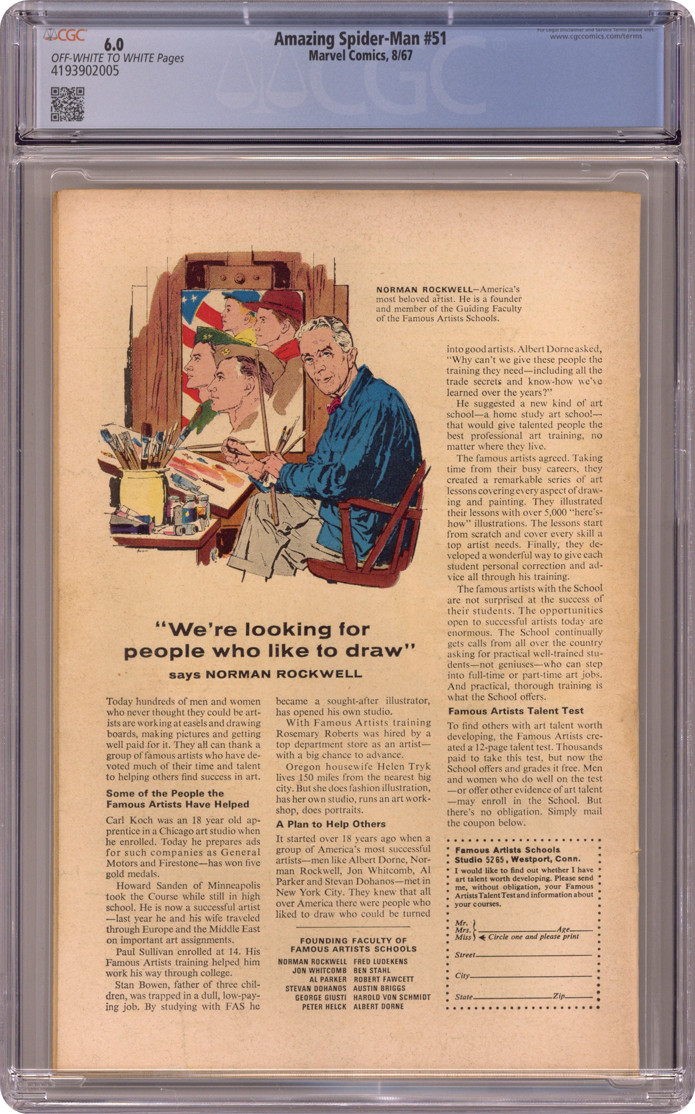 Cover by John Romita Sr. Second appearance of the Kingpin in In the Clutches of...the Kingpin!, script by Stan Lee, pencils by John Romita, inks by Mike Esposito (as Mickey Demeo); When the Kingpin orders that J. Jonah Jameson be silenced for his negative press on Fisk's illegal activites, Spidey swings in to save the EIC; But can the Wallcrawler take the big guy in a one-on-one brawl? Reprinted in Marvel Tales # 36. 36 pages, full color. Cover price $0.12. Grade: CGC 6.0 explanation of grade Condition: Used (collectible)