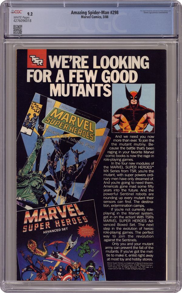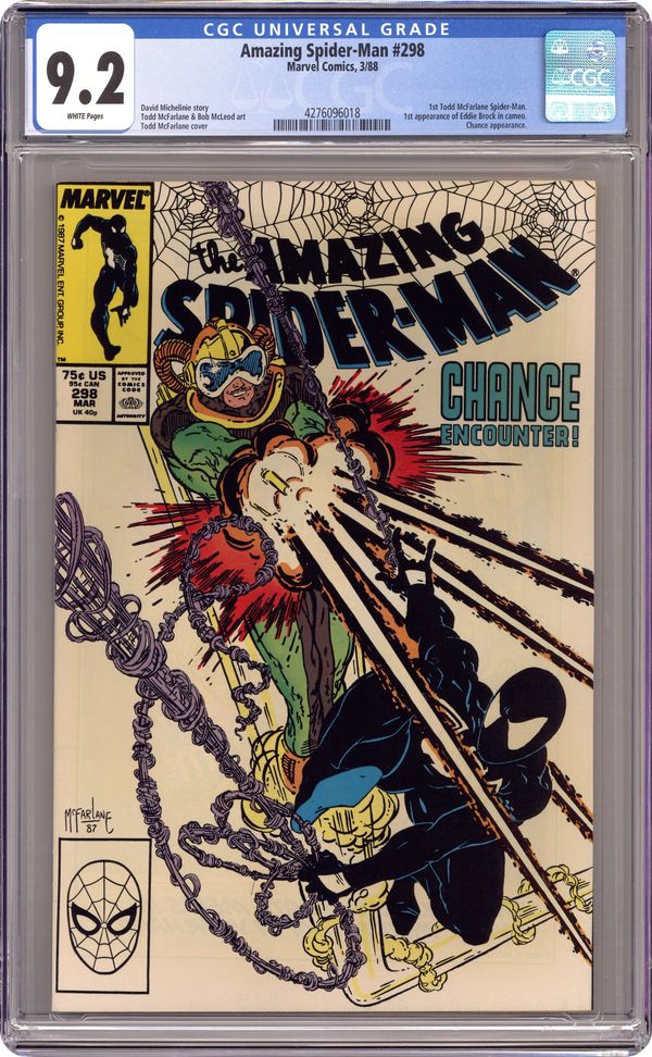 Direct Edition. "Chance Encounter!" Part 1 of 2. Script by David Michelinie. Pencils by Todd McFarlane. Inks by Bob McLeod. Cover by Todd McFarlane. Chance is back in business and working a new job for the Life Foundation! The clandestine organization wants Chance to steal an arms shipment coming into the west side docks! That should be a piece of cake for the high-flying mercenary! However, the Daily Bugle dispatches an undercover photographer to observe the delivery! And beneath the moonlit sky, fireworks explode when Chance and the Amazing Spider-Man throw down on the docks! First appearance (and cameo on the last page) by Eddie Brock (aka Venom). First appearance of Carlton Drake of the Life Foundation. Cameo appearances by Mary Jane Watson, Joy Mercado, and Joe Robertson. (Notes: Chance previously appeared in Web of Spider-Man 15. This issue begins Todd McFarlane's 2-year run as the penciler of the Amazing Spider-Man series.) 36 pages. Cover price $0.75. Grade: CGC 9.2 explanation of grade Condition: Used (collectible)