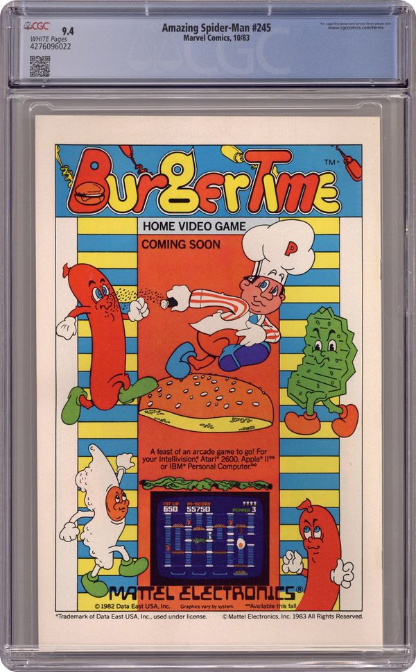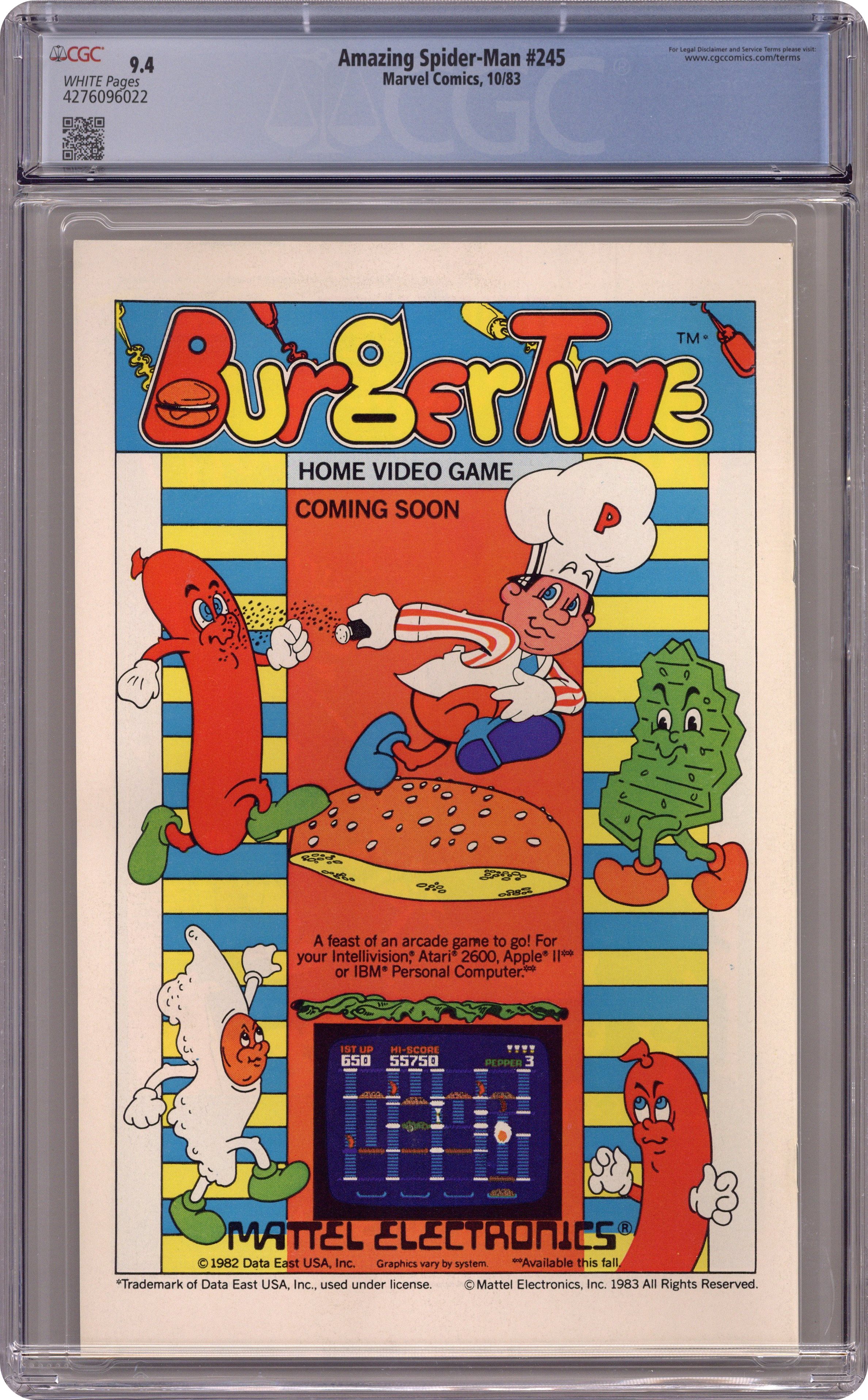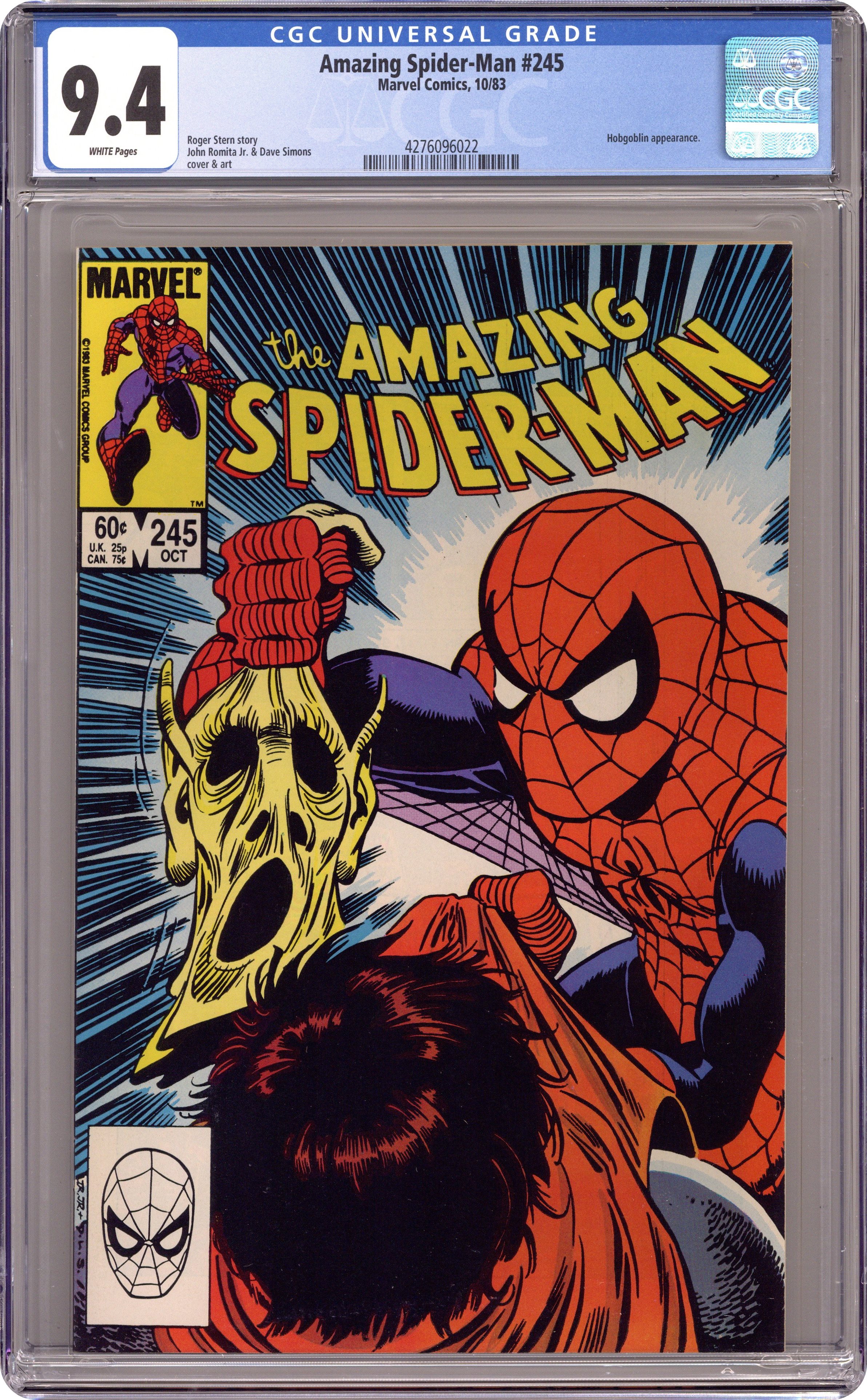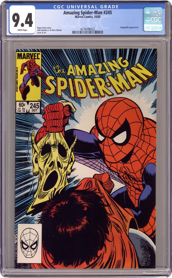 Direct Edition. "Sacrifice Play!" Part 2 of 2. Fourth appearance of the Hobgoblin. Script by Roger Stern. Art by John Romita Jr. (breakdowns) and Dave Simons (finishes). Cover by John Romita Jr. and Dave Simons. The wondrous wall-crawler thinks he knows who the Hobgoblin is! Lefty Donovan! Who? Apparently, the evidence from the police points in Lefty's direction! So, the web-slinger conducts a relentless search! And in the skies over Times Square, the Amazing Spider-Man and the (suddenly super-strong) Hobgoblin clash again! Will this battle solve the mystery of the goblin's identity? Or just add to the puzzle? Cameo appearances by Mary Jane Watson, Ned Leeds, and Betty Brant Leeds. (Note: The Hobgoblin appears next in Spectacular Spider-Man 85 -- a must read to keep up with the Hobgoblin's development.) 36 pgs. Cover price $0.60. Grade: CGC 9.4 explanation of grade Condition: Used (collectible)