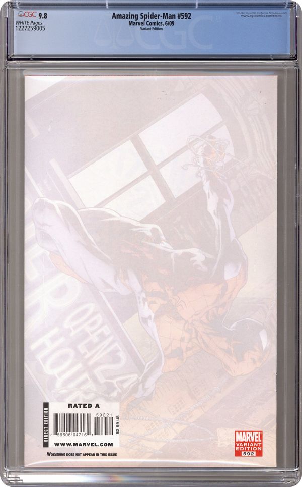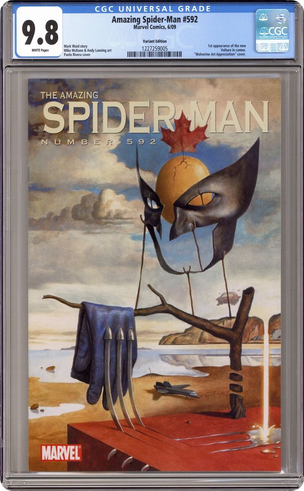 Limited Edition (1 for 10) Wolverine Art Appreciation Variant by PAOLO RIVERA. "24/7": Part 1 of 3 - Written by MARK WAID Penciled by MIKE MCKONE In the aftermath of Spidey's Fantastic Four voyage, his whole world is turned upside down by the new rules of the world. The good news is that after all these years, Spider-Man finally gets the upper hand on J. Jonah Jameson--but it's gonna cost him, particularly with the all-new Vulture winging into town! Plus--Peter drops by Aunt May's house for the shock of his life! Set your faces to stun! 36 PGS./Rated A ... Cover price $2.99. Grade: CGC 9.8 explanation of grade Condition: Used (collectible)