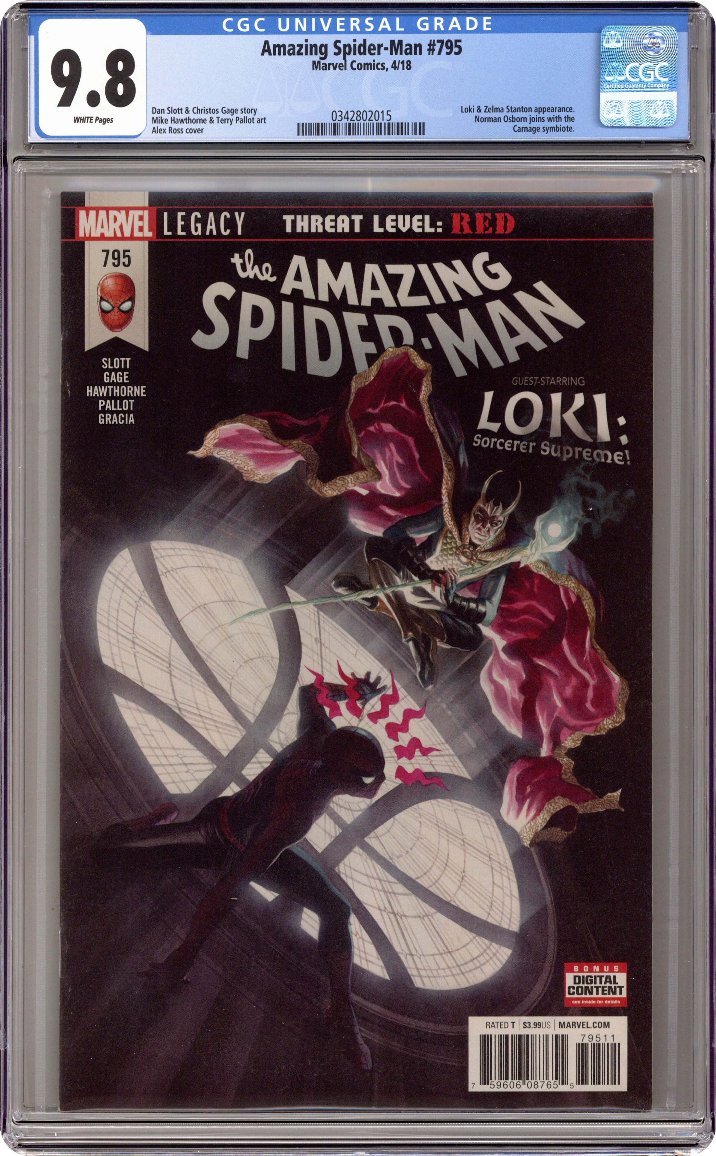 Ended Feb 22 2024 Winning Bid $36 Threat Level Red: Part 2 of 3 - Written by Dan Slott and Christos Gage. Art by Mike Hawthorne. Cover by Alex Ross. IS THERE A DOCTOR IN THE HOUSE?! Spidey pays the Sanctum Sanctorum a visit looking for a consult from the Master of the Mystic arts, Doctor Stephen Strange… …but finds himself face-to-face with the Master of Mischief and new Sorcerer Supreme - LOKI LAUFEYSON! And he's even MORE charming than in the movies! Don't believe us? Read this one and find out for yourself! 28 pages, full color. Rated T Cover price $3.99. Grade: CGC 9.8 explanation of grade Condition: Used (collectible)