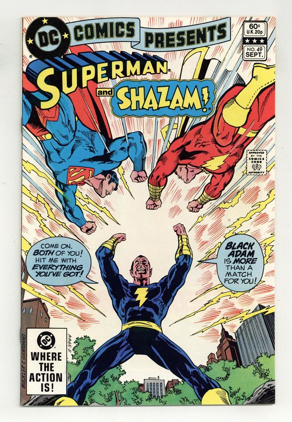 Ended Jan 2 2024 Winning Bid $27 Direct Edition. Captain Marvel for a Day (intended title, as noted in issue #54) - Written by Roy Thomas (plot) and Paul Kupperberg (script). Art by Rich Buckler and John Calnan. Cover by Rich Buckler and Dick Giordano. Can even the combined power of Superman and Captain Marvel stand up to the awesome might of Black Adam?! Characters in this issue: Superman; Captain Marvel (origin); Black Adam (villain, origin); The M.E.L.F. (villains); Shazam; Uncle Marvel [as Uncle Dudley]; Jimmy Olsen; Billy Batson (Earth-1). 32 pages, full color. Cover price $0.60. Grade: FN/VF 7.0 explanation of grade Condition: Used (collectible)