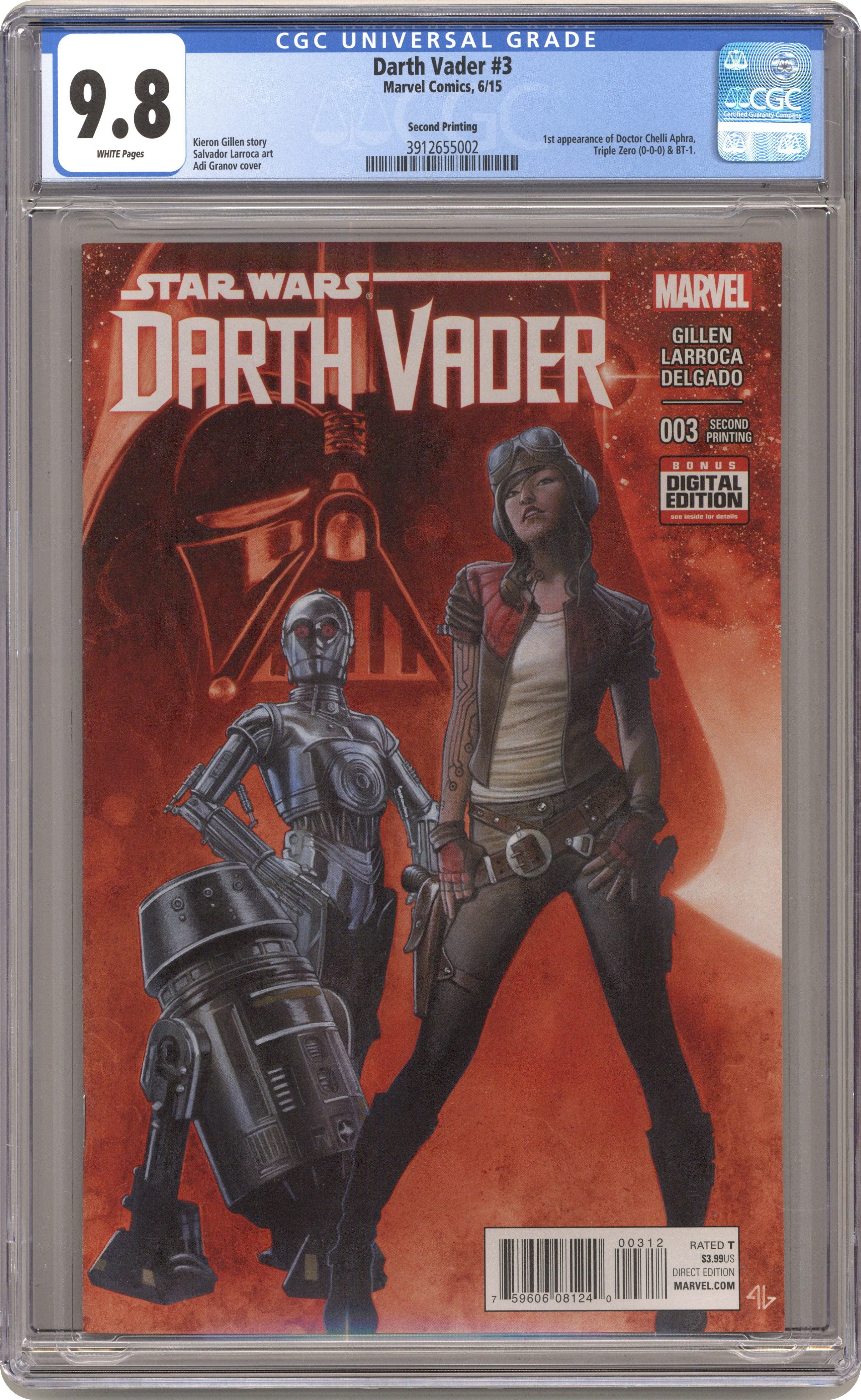 2nd Printing - Written by Kieron Gillen. Art by Salvador Larroca. Cover by Adi Granov. When a Dark Lord needs help, who can he turn to? Meet Aphra-the galaxy's foremost raider of lost weaponry! Plus: could these be the deadly droids she's looking for? 28 pages, full color. Rated T Cover price $3.99. Grade: CGC 9.8 explanation of grade Condition: Used (collectible)