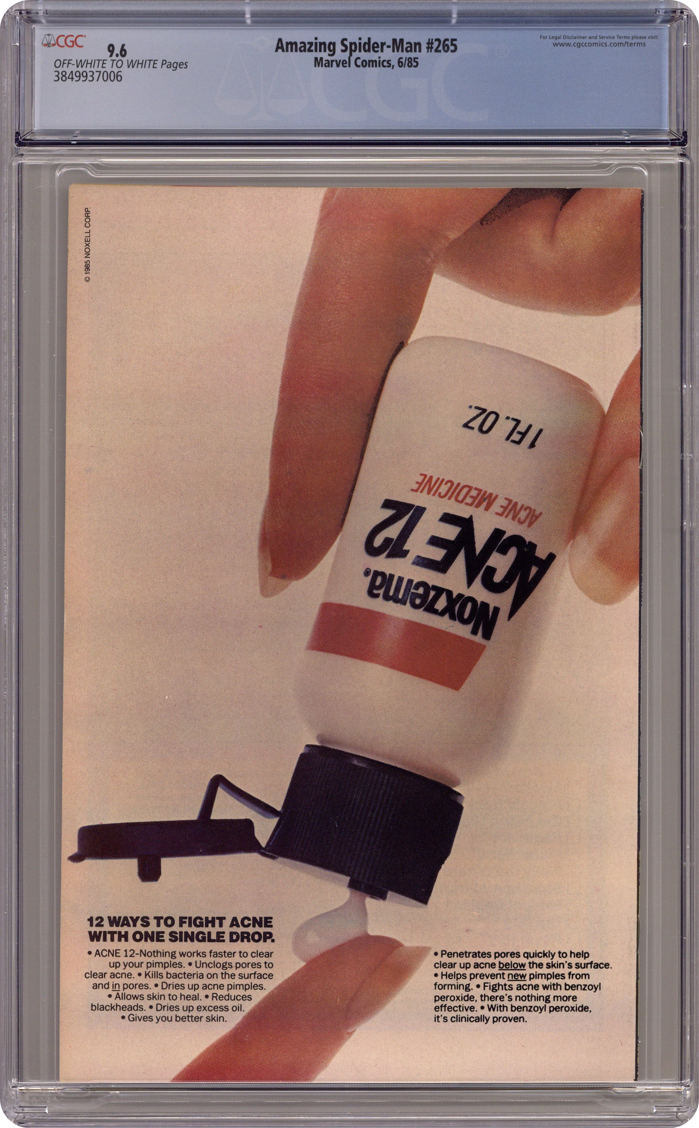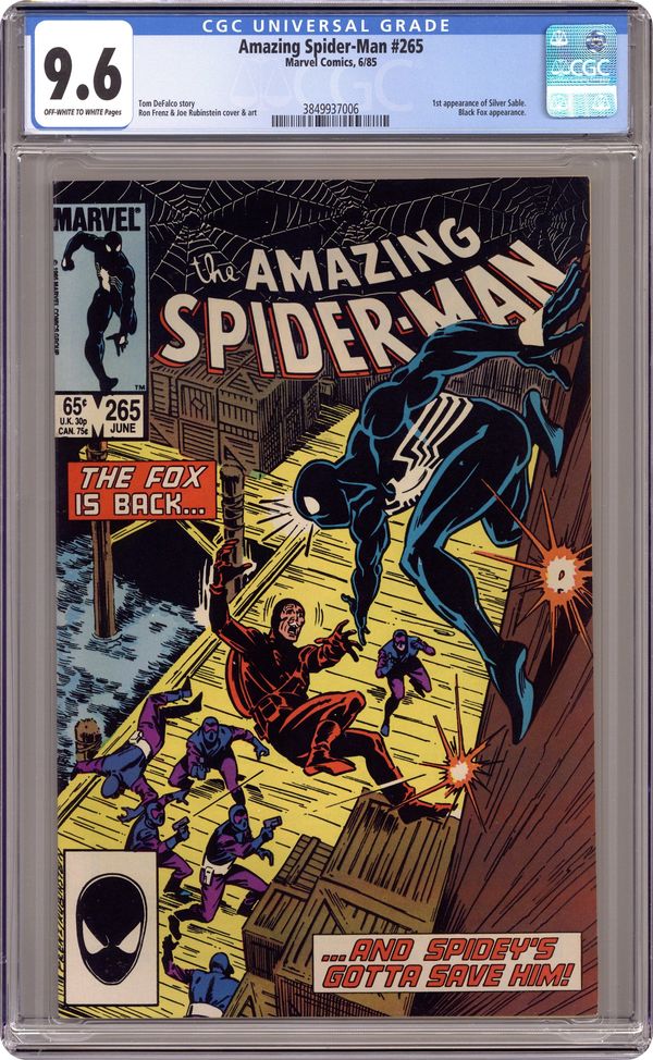 First printing. Direct Edition. First appearance of Silver Sable. Script by Tom DeFalco. Pencils by Ron Frenz. Inks by Joe Rubinstein. Cover by Ron Frenz and Joe Rubinstein. "After the Fox!". The Black Fox is on the run! But it's not the Spectacular Spider-Man who's chasing him! It's Silver Sable! An adventurer for hire from the European country of Symkaria! Silver Sable and her Wild Pack pursue the fox through the streets of Manhattan and then later corner him on the waterfront! However, the aging international jewel thief has a wall-crawling guardian angel! Down on the docks, the sparks fly as the web-slinger gives Silver Sable a lesson in diplomacy...superhero-style! Second appearance of the Black Fox. Cameo appearances by Aunt May, Mary Jane Watson, Harry Osborn, Liz Osborn, and Normie Osborn. (Notes: Silver Sable appears next in Amazing Spider-Man 279. The Black Fox returns in Web of Spider-Man 14. There is a second printing of this issue published in 1992. The second printing features a gray cover and a yellow dog ear touting the first appearance of Silver Sable. This story was also reprinted in Marvel Tales 277.) 36 pgs. Cover price $0.65. Grade: CGC 9.6 explanation of grade Condition: Used (collectible)