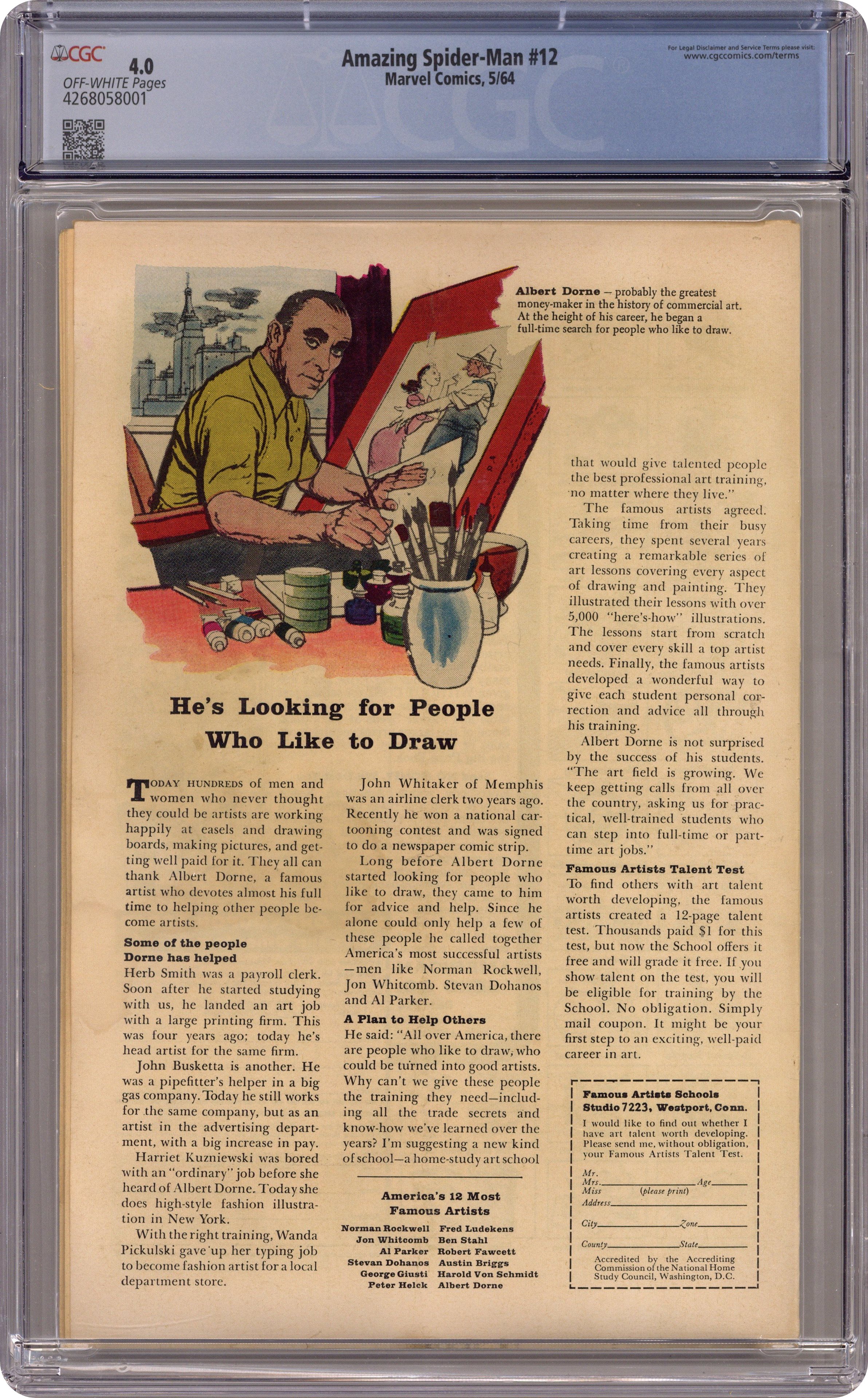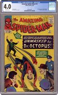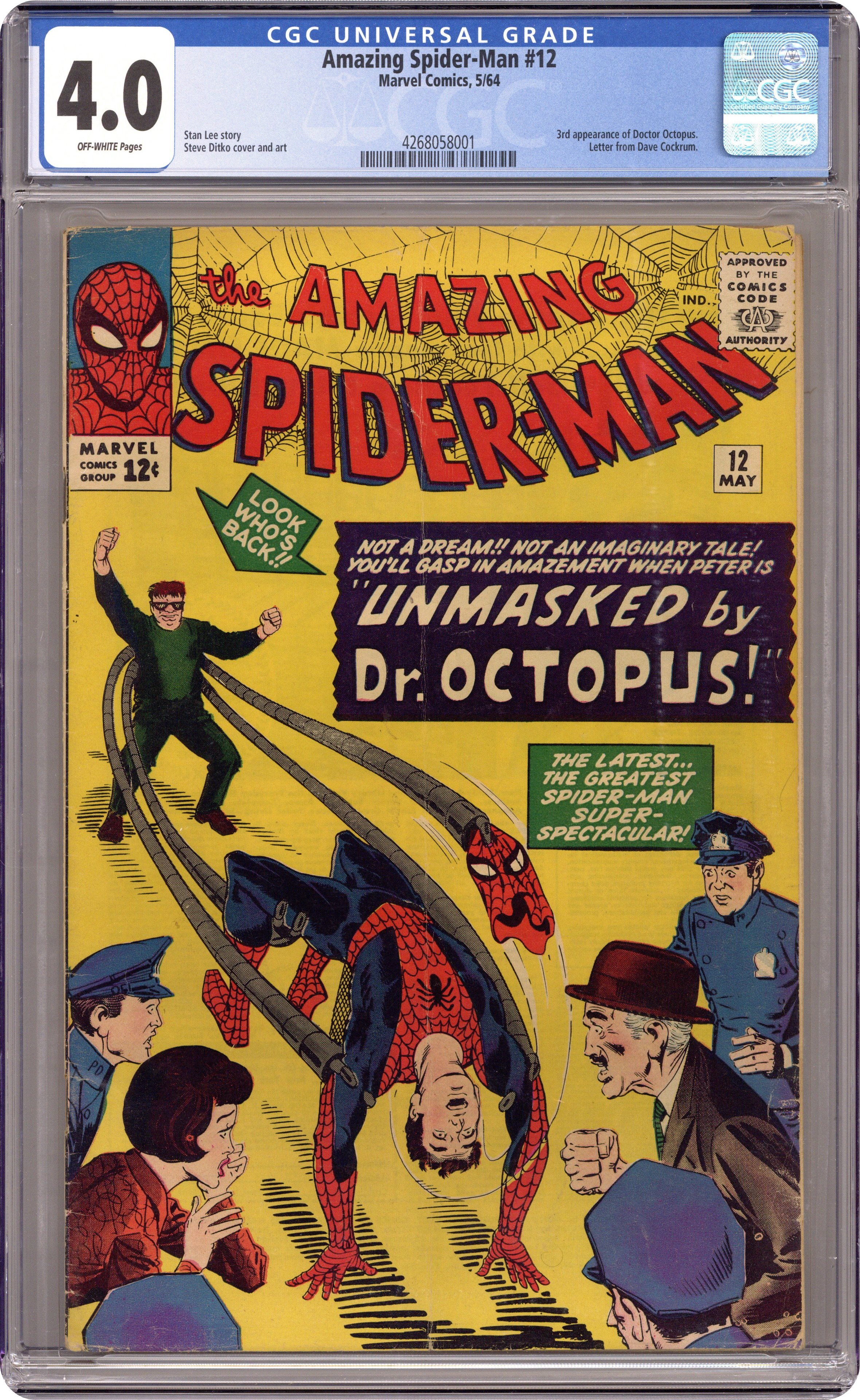 Cover art by Steve Ditko. Unmasked by Dr. Octopus!, script by Stan Lee, art by Steve Ditko; Peter has the 24 hour flu when Doc Ock captures Betty Brant in hopes of luring Spider-Man into battle; Ock beats the under the weather web-head and unmasks him, but everyone thinks it is just Peter trying to be brave by impersonating Spidey; Once he has recovered, Spider-Man battles through the wild animals Ock has released from the zoo to take on old six-arms himself. Reprinted in Marvel Tales # 149. Letter to the editor from comics artist Dave Cockrum. 36 pgs. $0.12. Cover price $0.12. Grade: CGC 4.0 explanation of grade Condition: Used (collectible)