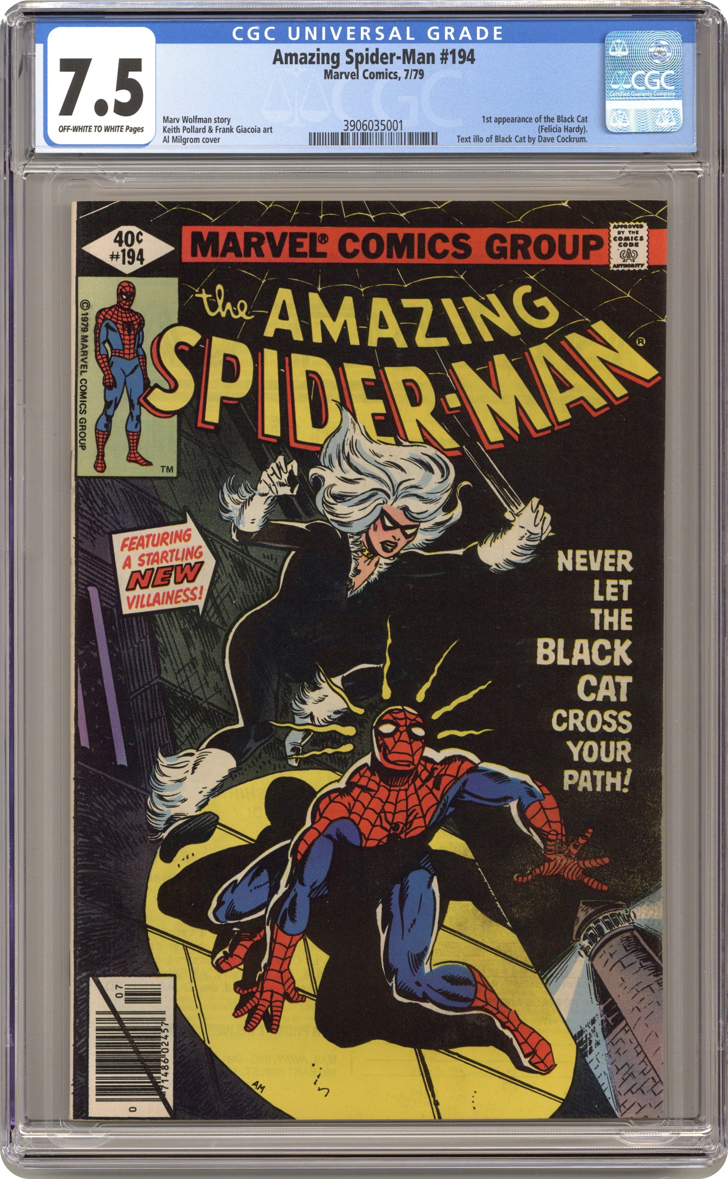 Ended Oct 23 2023 Winning Bid $210 Direct Edition. First appearance of the Black Cat in "Never Let The Black Cat Cross Your Path!" Part 1 of 2. Script by Marv Wolfman. Art by Keith Pollard (breakdowns) and Frank Giacoia (finishes). Cover by Al Milgrom. One of the landmark issues of the Amazing Spider-Man series! The dazzling debut of the Black Cat! The wall-crawler has spent the first 193 issues of his title chasing super-villains! But tonight he's going to kiss one instead! Wow! Does the web-slinger stand a chance against the beauty and charm of Felicia Hardy? Not when the alluring cat has his tongue! And maybe later his heart! A terrific issue! Cameo appearances by Aunt May, Betty Brant, Ned Leeds, Harry Osborn, Flash Thompson, Mysterio (in civilian clothes), and the burglar. (Notes: The Black Cat is the creative highlight of the Wolfman-Pollard run on the Amazing Spider-Man title. Dave Cockrum designed the cat's costume. The letters page includes an alternate cover (for issue 194) by Keith Pollard. It also includes an alternate cover to Spider-Woman 9 by Carmine Infantino. This two-part story was reprinted in the trade paperback: Spider-Man vs. the Black Cat (2005). 36 pages, full color. Cover price $0.40. Grade: CGC 7.5 explanation of grade Condition: Used (collectible)