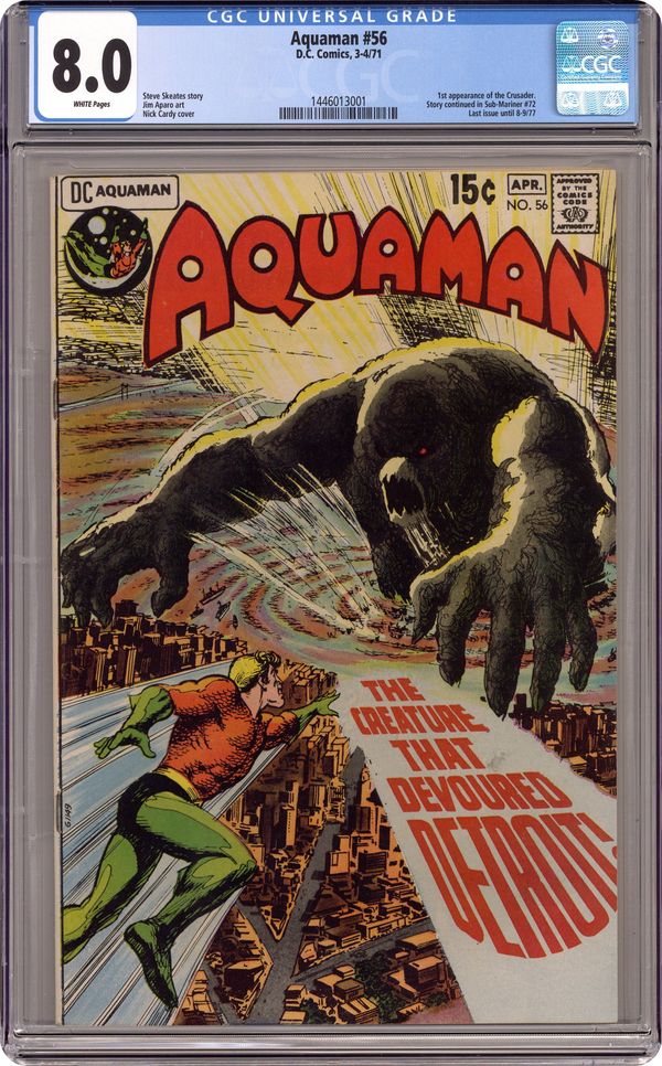 Ended Oct 13 2023 Winning Bid $78 Cover art by Nick Cardy. The Creature that Devoured Detroit!, script by Steve Skeates, art by Jim Aparo; while waiting to appear on a talk show, Aquaman learns that Detroit is being covered by algae from Lake Erie. The Cave of Death!, script by Steve Skeates, art by Jim Aparo; Aquagirl rescues a kid playing near a cave. Last 15c cover-priced issue. NOTE: Next issue, #57, isn't published until Sept. 1979. 36 pgs. $0.15. NOTE: Aquaman #56 and Sub-Mariner #72 is the infamous hidden DC/Marvel crossover! Writer Steve Skeates, unbeknownst to the editorial staffs of Marvel and DC, creates the very first intercompany crossover between the Big Two. Aquaman battles a creature that at the end of the issue explodes in outer space. A few years later, the very same creature emerges in the Marvel Universe from an explosion in outer space. This has to be one of the most underrated and coolest hidden gems in Comics History. – Odinson, Lone Star Comics Archivist Cover price $0.15. Grade: CGC 8.0 explanation of grade Condition: Used (collectible)