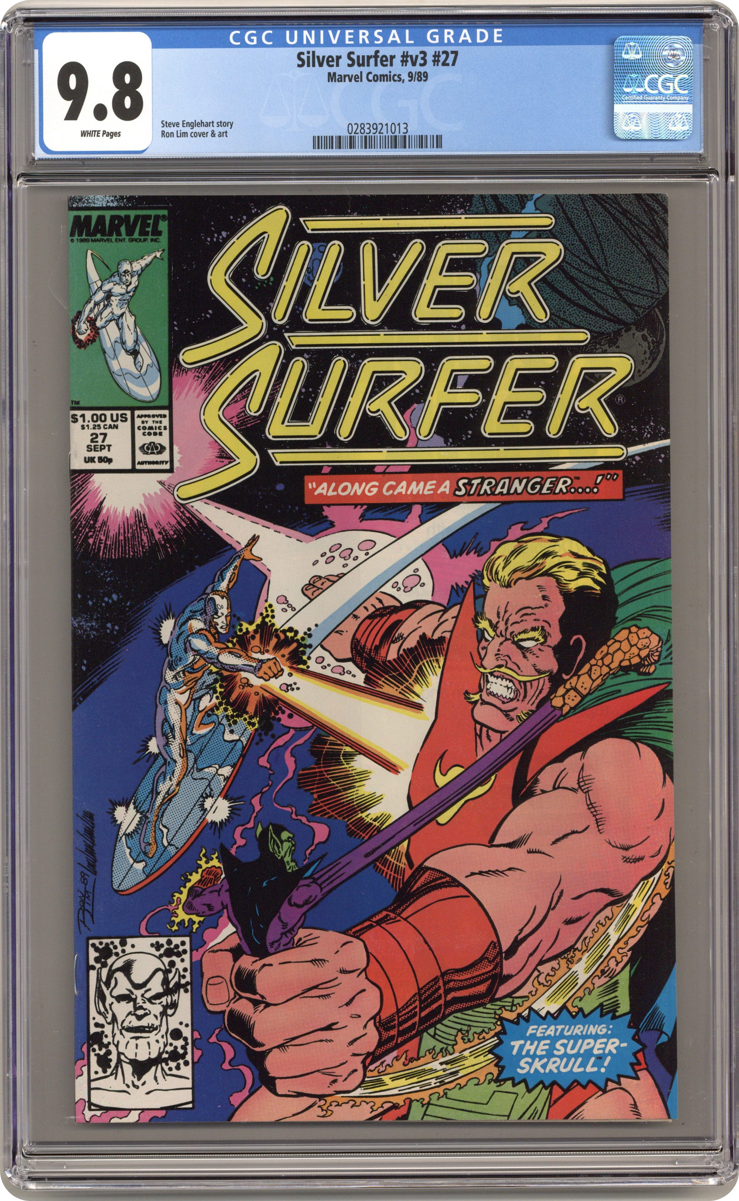 Kree/Skrull War. "The R Complex!" Guest-starring the Super-Skrull. Story by Steve Englehart. Art by Ron Lim and Tom Christopher. The cosmic deity the Stranger has come for Empress S'Byll, the woman who will return the Skrull Empire to glory. Can even the combined might of the Silver Surfer and the Super Skrull dissuade this being of immeasurable power? 32 pages. Cover price $1.00. Grade: CGC 9.8 explanation of grade Condition: Used (collectible)