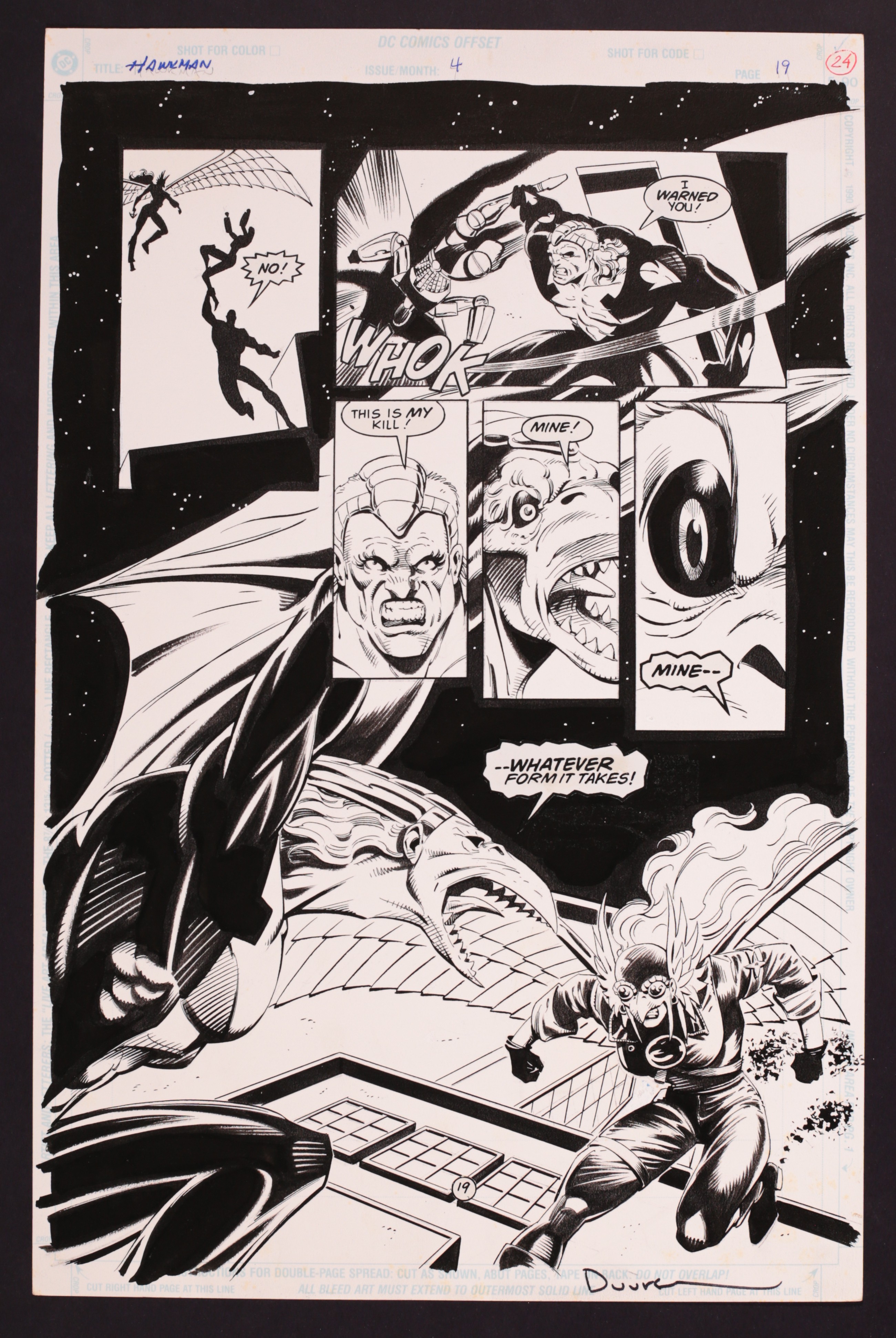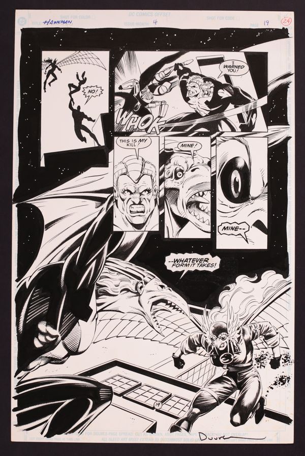 A tremendous fight page that sees Hawkman (that's right! Katar has been trapped in Shayera's body by the evil Count Viper!) losing his airborne advantage when Airstryke uses his transformation powers to take to the skies. Signed by Duursema in bottom margin. Pencil and ink on DC Comics art board. 11" x 17", B&W.