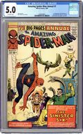 Cover art by Steve Ditko. First appearance of the Sinister Six (Doctor Octopus, Electro, Kraven the Hunter, Mysterio, Sandman, and the Vulture) in a new 41-page story, "The Sinister Six!" Script by Stan Lee, art by Steve Ditko; Dr. Octopus organizes the Sinister Six, composed of other Spider-Man Villains; They capture Betty Brant and Aunt May and force Spider-Man to rescue them. Cameos by the X-Men, the Fantastic Four, Captain America, Thor, Iron Man, Iron Man, Giant Man, and the Wasp. Lots of back-up features (all art by Ditko): 14 pages of pin-ups (Spider-Man's most famous foes); 9-page "The Secrets of Spider-Man"; 3-page "How Stan Lee and Steve Ditko Create Spider-Man!"; and other miscellaneous pin-ups. Giant 76-page issue! Most of this issue reprinted in Marvel Tales # 150. 76 pgs., full color. Cover price $0.25. Grade: CGC 5.0 explanation of grade Condition: Used (collectible)
