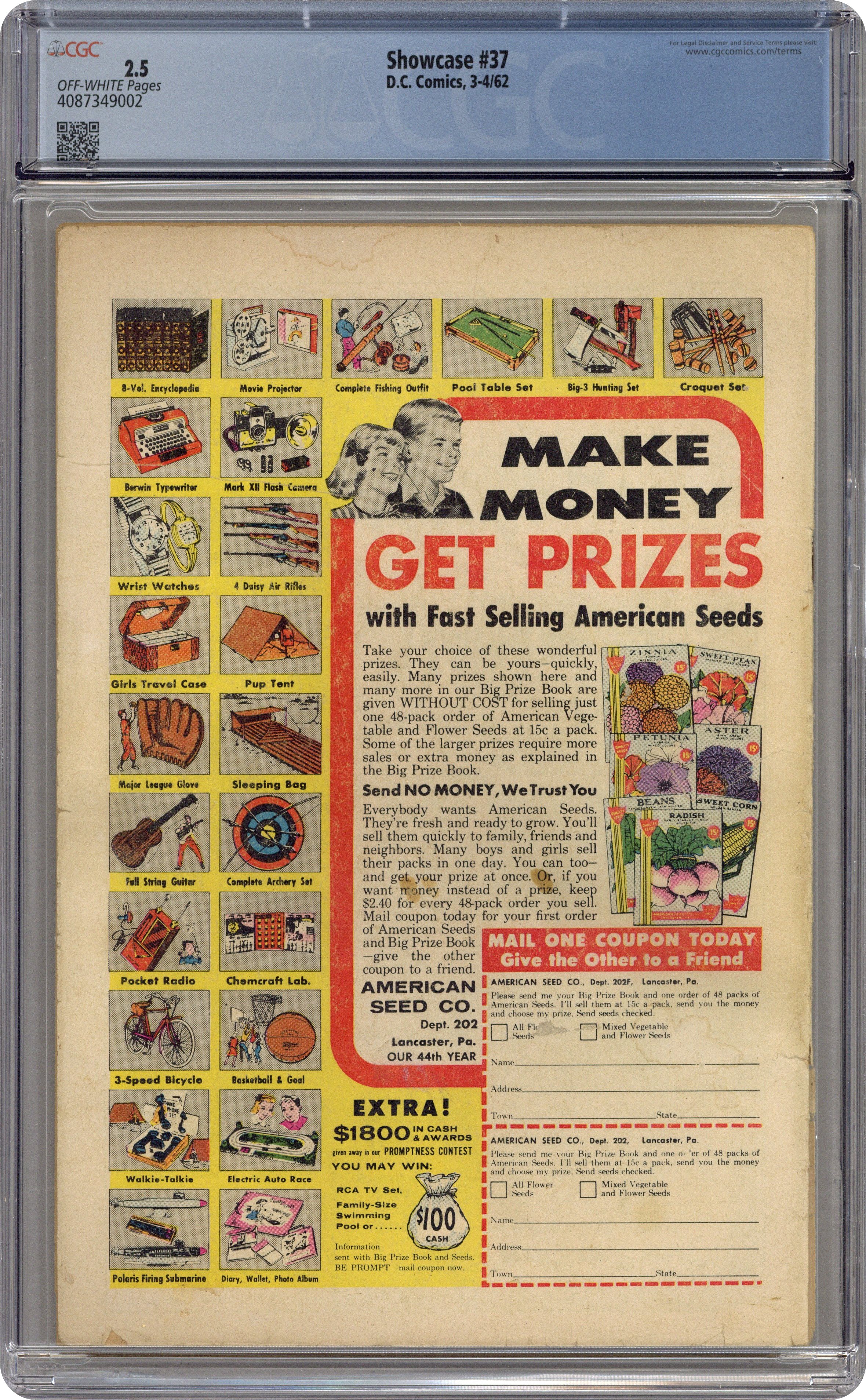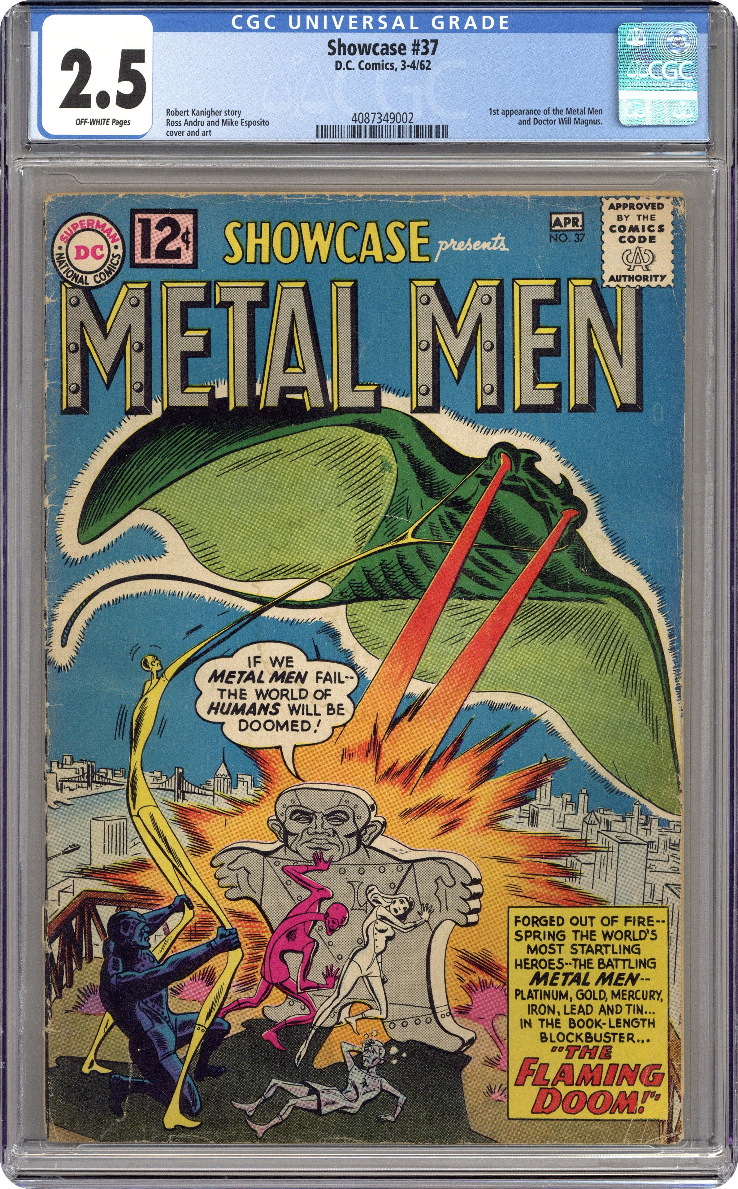 Cover pencils by Ross Andru, inks by Mike Esposito. 1st appearance of the Metal Men in The Flaming Doom! (Part I), script by Robert Kanigher, pencils by Ross Andru, inks by Mike Esposito; In prehistoric times, a flying manta ray survives a "radioactive storm" and is encased in ice; Today, it breaks free and soars over the coast, zapping lighthouses, jets, and the Chrysler Building with laser-eyes. Ad for Justice League of America 10 and Aquaman 2. Part II The Metal Men vs The Flaming Doom!, script by Bob Kanigher, pencils by Ross Andru, inks by Mike Esposito; The Metal Men are going into battle, but Tina will stay "out of harm's way"; Oh, no, she won't, and spins Doc in a cocoon until he relents; Boarding a "rocket disc," they find the flying manta at the bridge. The Magic Metal article; Uses of cobalt throughout history. Metal Facts and Fancies article. Part III The Metal Men vs The Flaming Doom!, script by Robert Kanigher, pencils by Ross Andru, inks by Mike Esposito; Lead forms a shield to block the creature's blasting eyebeams; Gold stretches and grabs while Iron anchors him, but they're pulled aloft to crash into the ocean; Col. Casper radios to call it off, they failed. 36 Pages, Full Color. Cover price $0.12. Grade: CGC 2.5 explanation of grade Condition: Used (collectible)