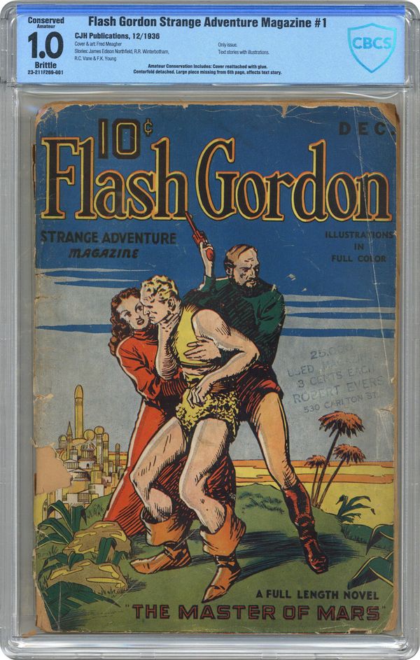 Ended Jan 23 2024 Winning Bid $200 Rare pulp issue. Cover and eight full-page color illustrations by Fred Meagher. "The Master of Mars" novel starring Flash Gordon, plus three other unrelated stories. Only issue of series. 7 1/2-in. x 10-in., 96 pages, black and white (text with illustrations). Cover price $0.10. Grade: CBCS 1.0 explanation of grade Condition: Used (collectible)