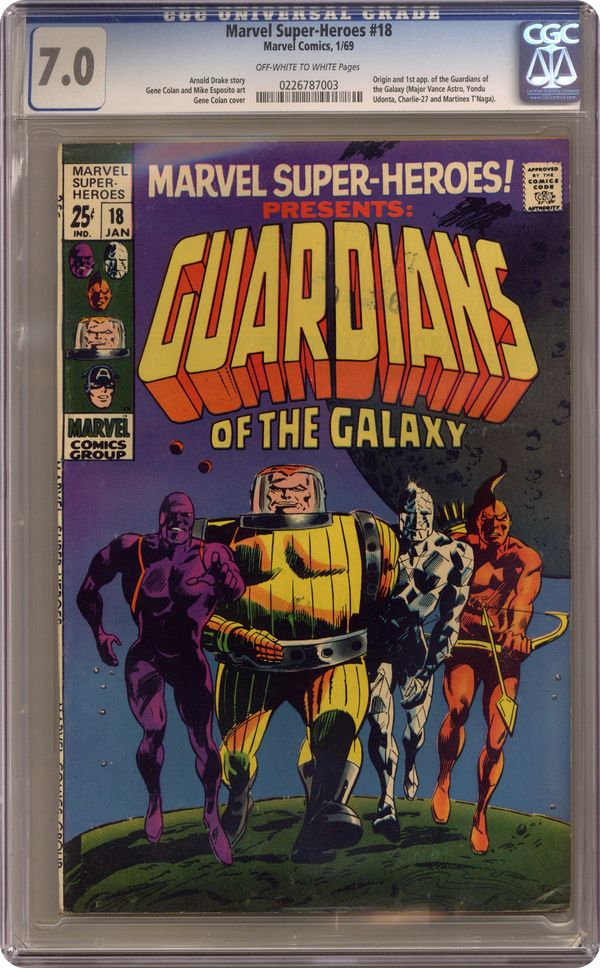 Ended Oct 13 2023 Winning Bid $270 Giant-size issue. Origin and 1st appearance of the Guardians of the Galaxy. Script by Arnold Drake, pencils by Gene Colan, inks by Mike Esposito (as Mickey Demeo). The remainder of the issue contains Golden Age reprints: the Sub-Mariner ("Courage"); and the All Winners Squad featuring Miss America, the Human Torch, and Captain America (from All Winners 21). Letter to the editor from comics writer Steven Grant. Colan cover pencils. Cover price $0.25. Grade: CGC 7.0 explanation of grade Condition: Used (collectible)