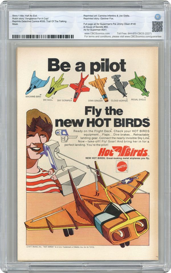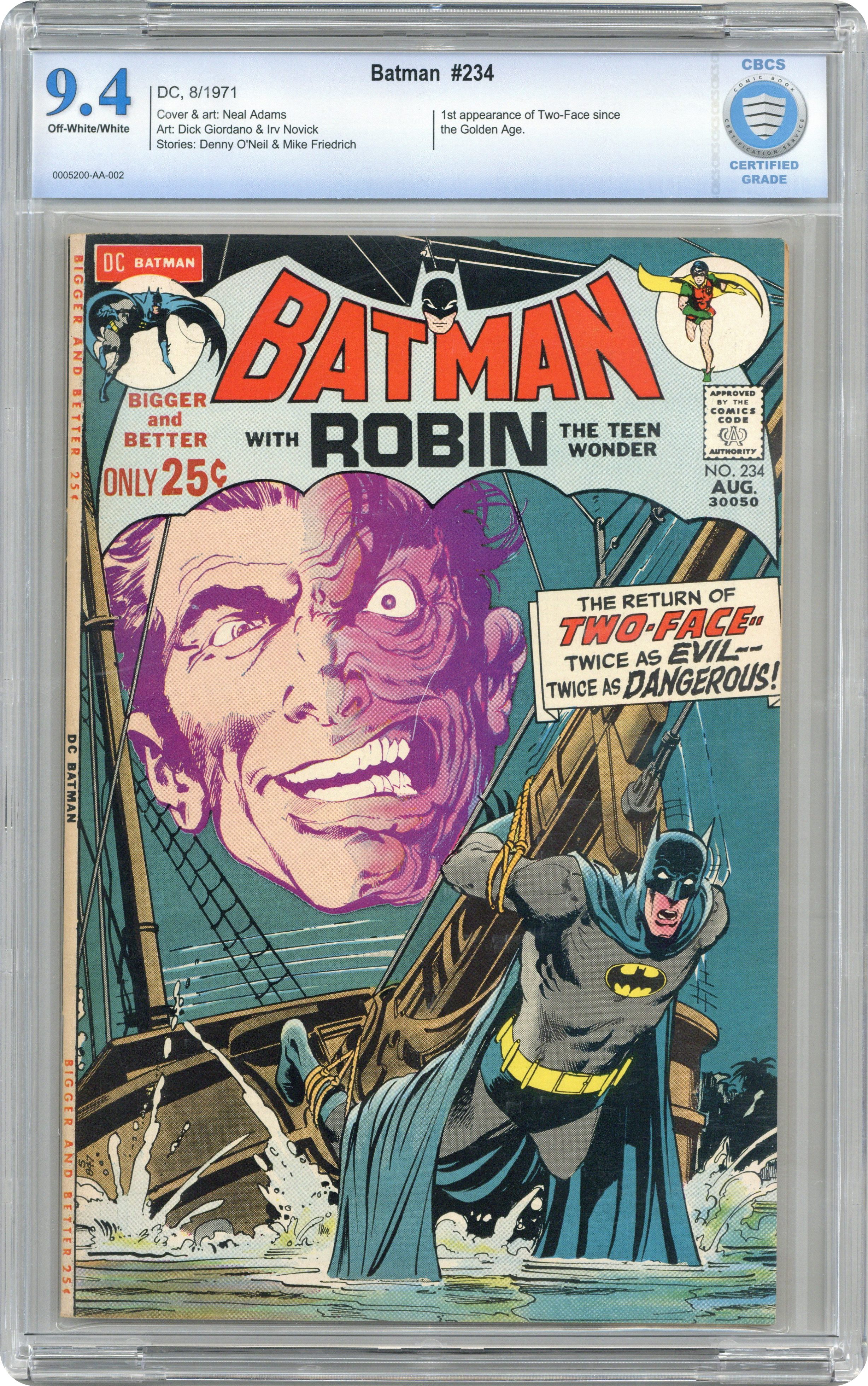 Ended Apr 20 2024 Winning Bid $910 Batman stars in the story "Half an Evil" which is the first appearance of the Silver-Age Two Face. Script by Denny O' Neil, pencils by Neal Adams, inks by Dick Giordano. Robin stars in the story "Vengeance for a Cop." Script by Mike Friedrich, pencils by Irv Novick, inks by Giordano. Reprint: 1964 story "Trail of the Talking Mask" which introduces the "new look" for Batman, symbolized by the addition of an oval around the bat-insignia. Script by Gardner Fox, pencils by Carmine Infantino, and inks by Joe Giella. Letter to the editor from comics writer Bob Rozakis (misspelled "Razakis"). Adams cover. 52 Pages, Full Color. Cover price $0.25. Grade: CBCS 9.4 explanation of grade Condition: Used (collectible)