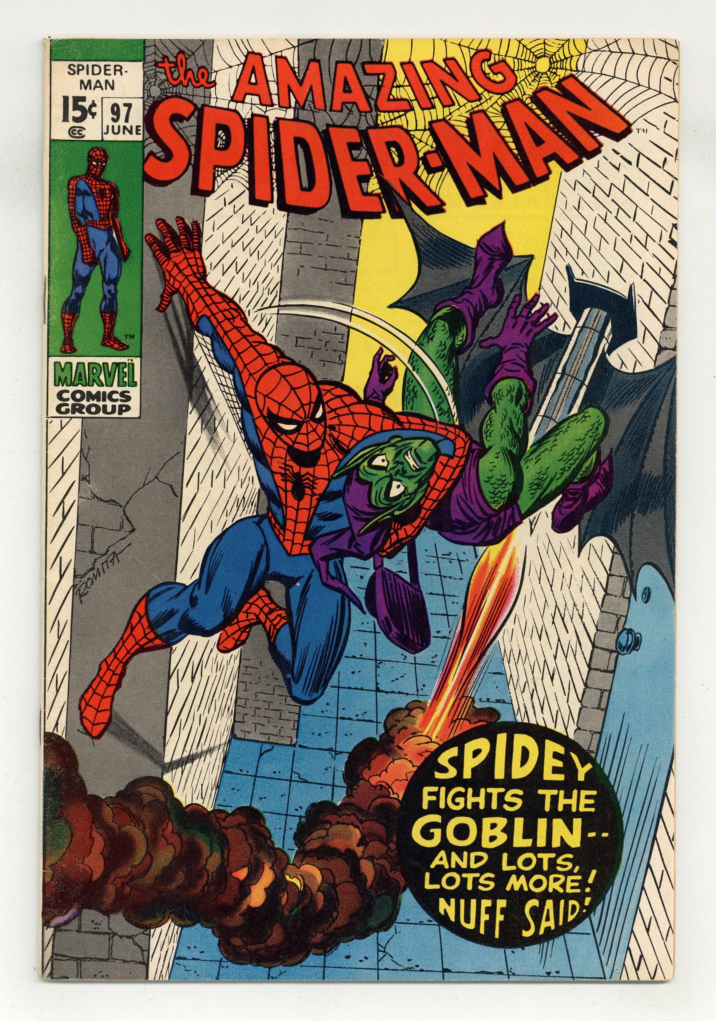 Not approved by the Comics Code Authority. "In the Grip of the Goblin!" Part 2 of 3. Script by Stan Lee. Pencils by Gil Kane. Inks by Frank Giacoia and John Romita. Cover by John Romita. The fireworks start immediately as the Amazing Spider-Man battles the Green Goblin! And since the web-slinger is always cautious fighting Norman Osborn's alter ego, the goblin wins rounds one -- thanks to his assortment of bizarre weapons! As Peter Parker heads home, he knows the goblin could reveal his secret identity at any moment. But right now Peter has a second problem. His roommate Harry is miffed about Mary Jane...and popping pills left and right! When Peter calls a doctor to get Harry help, someone clad in purple and green shows up first! Oh no, the wall-crawler is caught between a rock and a hard place...with no way out! (Note: This story was reprinted in Marvel Tales #78.) 36 pages. Cover price $0.15. Grade: FN/VF 7.0 explanation of grade Condition: Used (collectible)