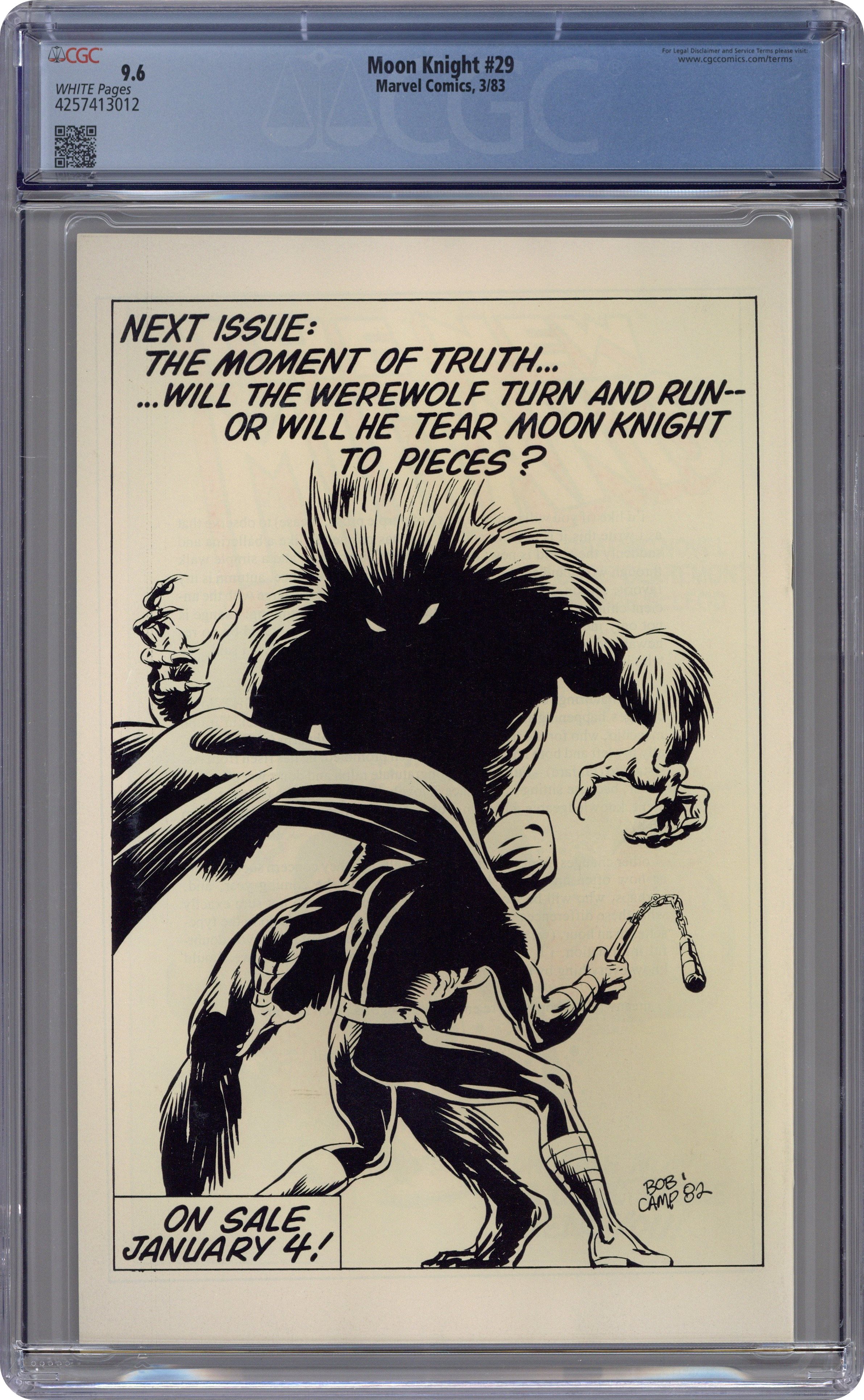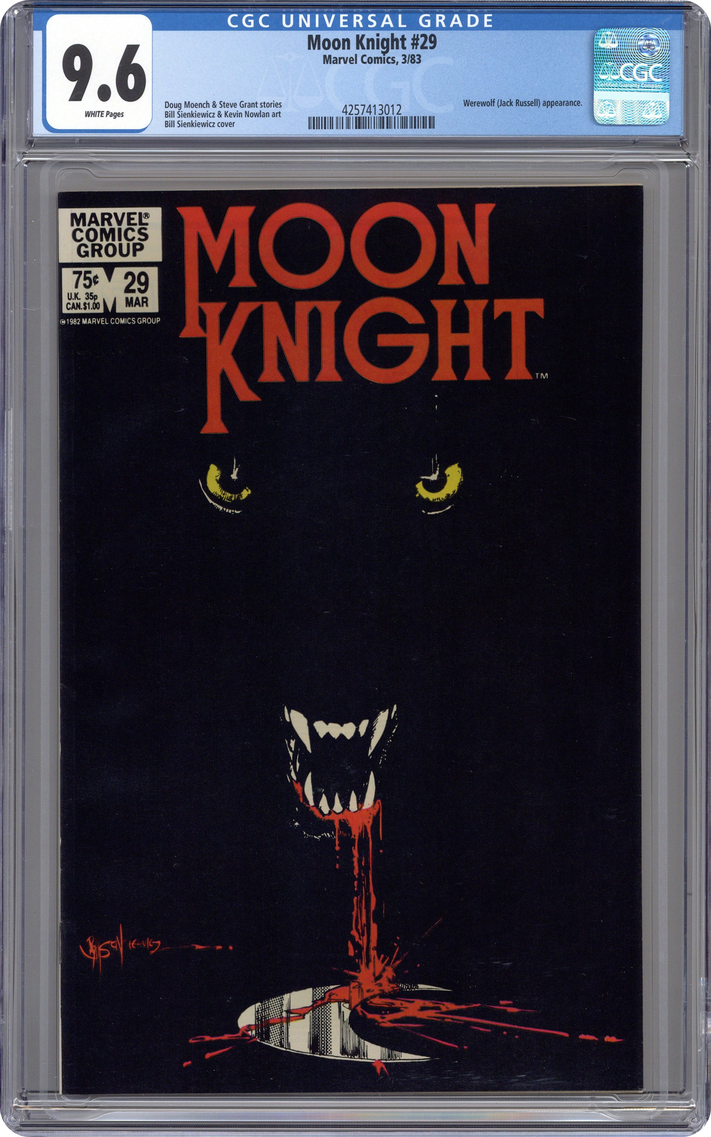Part 1 of 2 - "Morning Star!" Guest-starring Werewolf by Night (Jack Russell). Written by Doug Moench. Art and cover by Bill Sienkiewicz. Moon Knight tries to track down Werewolf by Night before he is captured by a Satanic cult whose leader plans to use him to prove his demonic power. Includes the back-up tale "Colloquy!" By Steven Grant and Kevin Nowlan. 32 pages, FC. Cover price $0.75. Grade: CGC 9.6 explanation of grade Condition: Used (collectible)