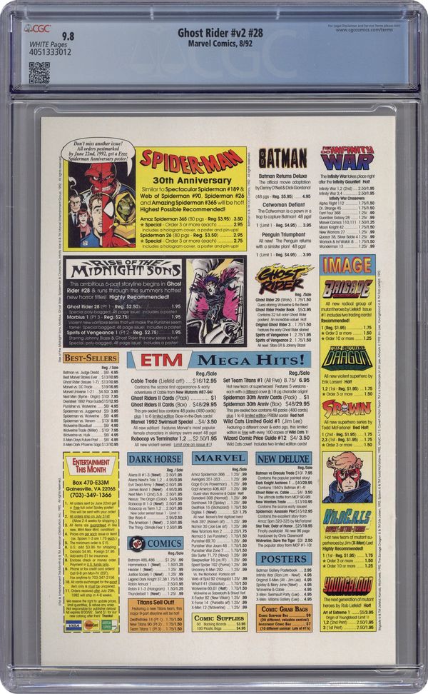 Ended Mar 5 2024 Winning Bid $71 Direct Edition. Rise of the Midnight Sons: Part 1 of 6 - " Visions!" Guest-starring Doctor Strange. Written by Howard Mackie. Art by Andy Kubert and Joe Kubert. Ghost Rider captures two criminals who murdered an elderly woman and deposits them in the mausoleum where he has kept Blackout, Stern, and dozens of other criminals captive. At the Ketch house, Stacy and Gerard Dolan console Francis Ketch over Dan's disappearance. Dolan then gets a call that the police are about to arrest Ghost Rider and leaves to assist. At the cemetery, a man calling himself the Caretaker greets Johnny Blaze and Ghost Rider and tells them the police have surrounded the cemetery. Ghost Rider opens the mausoleum to find all of his captives dead, and, within the void, Dan's spirit experiences a vision given to him by Lilith of an assemblage of supernatural heroes. Blackout and Stern emerge from the crypt and Blackout bites Ghost Rider, causing to experience Lilith's vision as well. Blackout realizes Lilith is his mother and vows to find her. Blackout and Stern flee the mausoleum amidst police gunfire. Michael Badilino, the officer in charge, enters the mausoleum to arrest Ghost Rider, but Caretaker hits him with a shovel and leads Ghost Rider and Blaze through underground tunnels to an unoccupied section of the cemetery. Blackout attempts to flee on a bike Blaze stored in the cemetery, but flees on foot when Blaze sets the bike ablaze hellfire. Blaze, on the flaming bike, and Ghost Rider leave to meet with the Quentin Carnival in Rhode Island, and Caretaker asks the arriving Doctor Strange if he believes he can defeat Lilith. Story continues in Ghost Rider/Blaze: Spirits of Vengeance (1992) #1. 32 pages, FC. Cover price $2.50. Grade: CGC 9.8 explanation of grade Condition: Used (collectible)