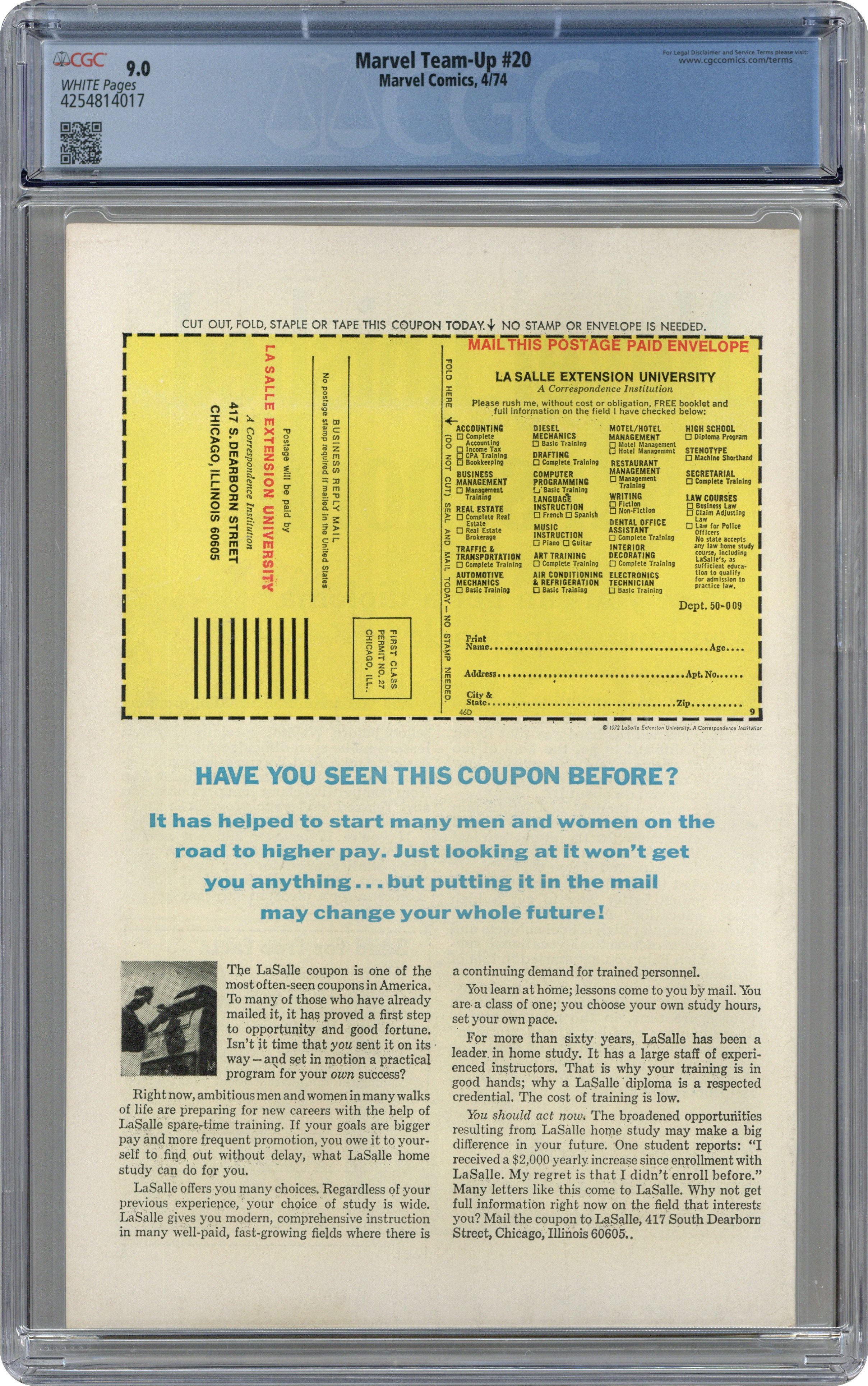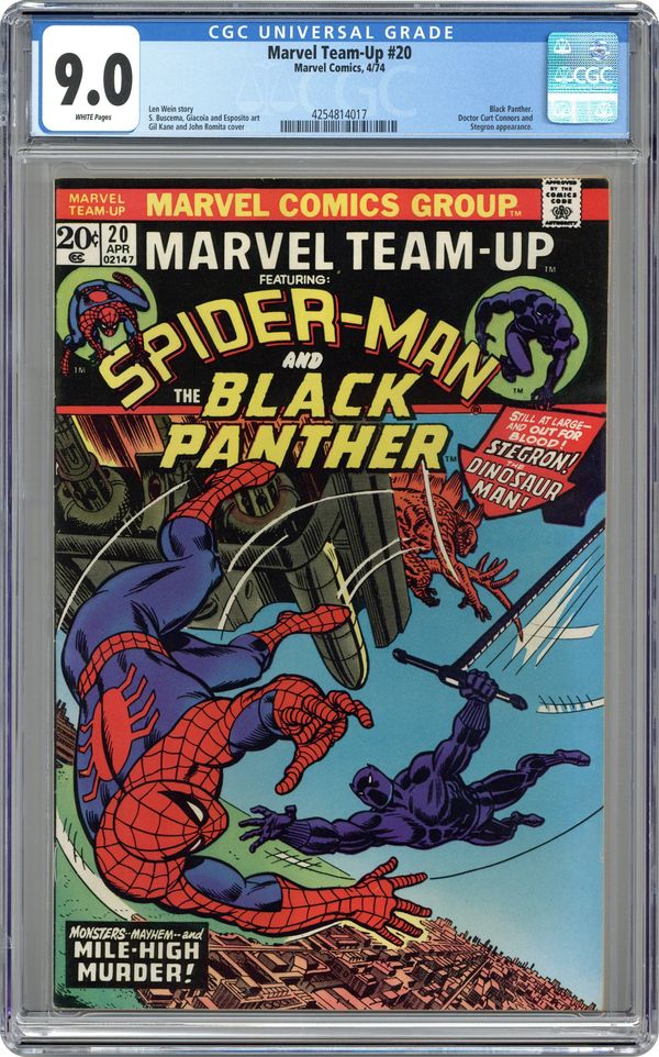 Spider-Man and the Black Panther in "Dinosaurs on Broadway!" Part 2 of 2 (Continued from previous issue). Script by Len Wein. Pencils by Sal Buscema. Inks by Mike Esposito and Frank Giacoia. Cover by Gil Kane and John Romita. Spider-Man and the Black Panther battle Stegron and his dino-minions in Times Square. Cameo appearances by Jarvis, J. Jonah Jameson, Joe Robertson, and Mary Jane Watson. Flashback cameo featuring Ka-Zar. Last 20ยข issue. (Stegron returns in Amazing Spider-Man 165. This issue was reprinted in Marvel Treasury Edition 22. The letters page contains Marvel Value Stamp Series A #25 Human Torch.) 36 pages. Cover price $0.20. Grade: CGC 9.0 explanation of grade Condition: Used (collectible)