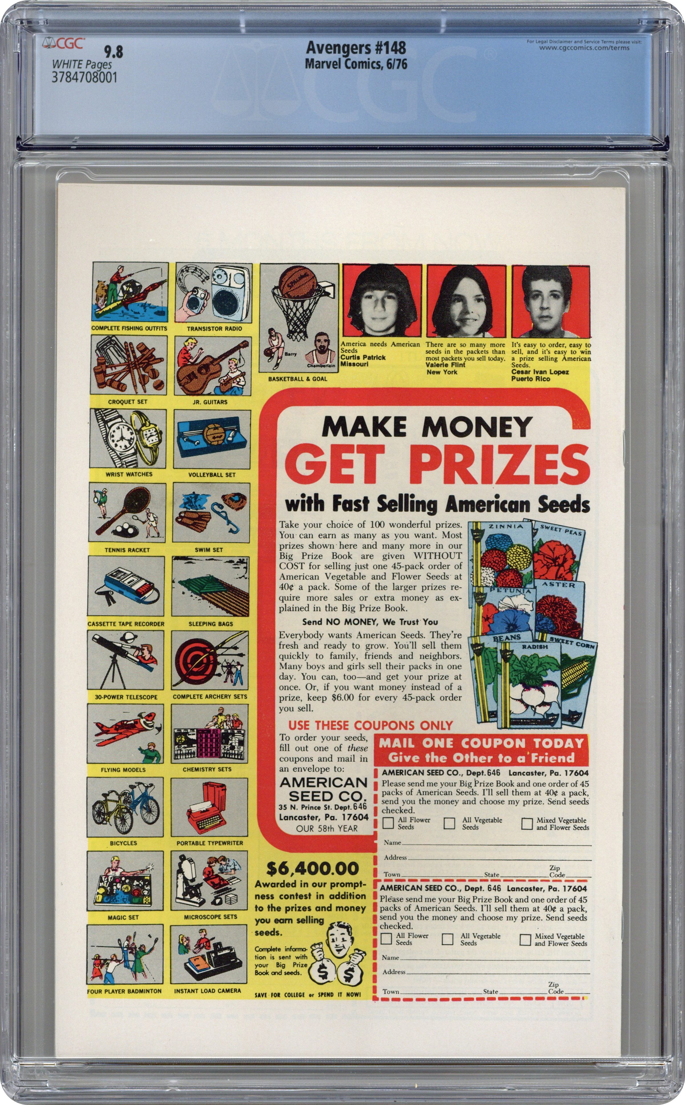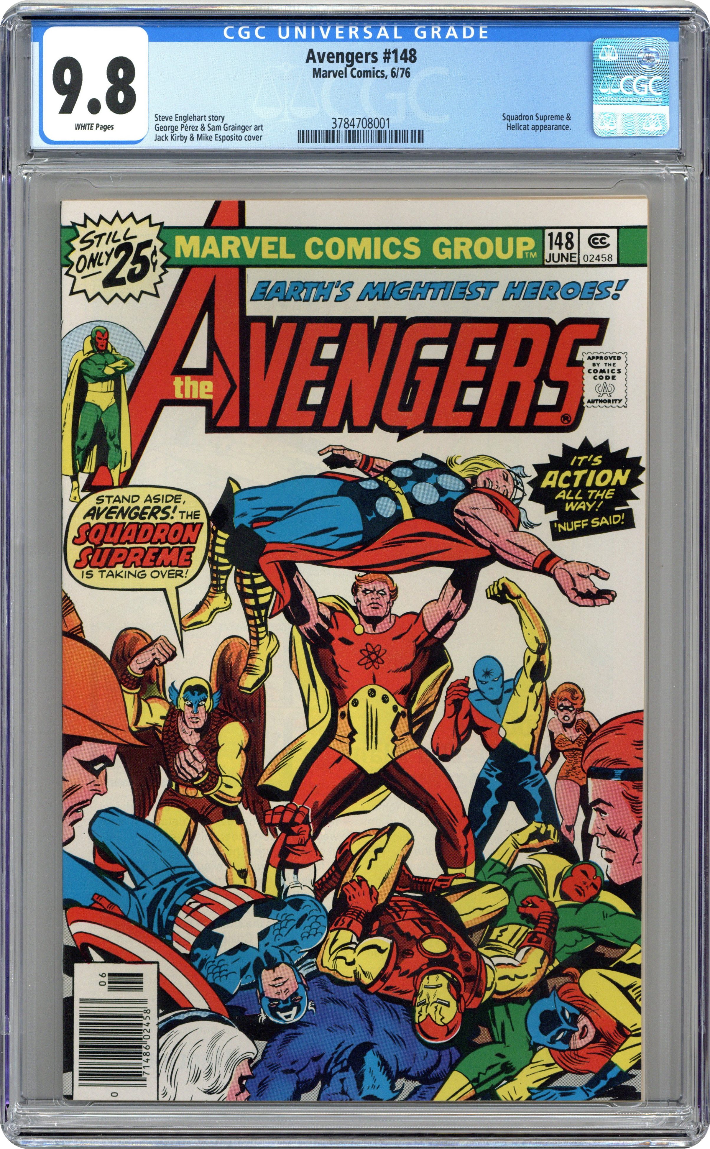 "20,000 Leagues Under Justice!" Part 6 of 7. Script by Steve Englehart. Pencils by George Perez. Inks by Sam Grainger. Cover by Jack Kirby and Mike Esposito. The Avengers' battles against the Squadron Supreme continue in the streets of Other-Earth! On the undercard: Hellcat and the Beast vs. Tom Thumb, Amphibion, and Cap'n Hawk! And the main event: Captain America and Iron Man vs. Doctor Spectrum and the Whizzer! Wow, a sensational action issue! Can Earth's Mightiest Heroes finally defeat the Squadron Supreme and find a way back home? Cameo appearances by Thor, Moondragon, the Wasp, and Yellowjacket. (Notes: Although depicted on the cover, Thor is not with the Avengers on the Squadron's world. The Squadron's Earth was later designated Earth-712. The Squadron Supreme's next adventures take place in Thor 280 and Defenders 112-114. The letters page includes letters from comics historian Peter Sanderson and comics writer Mary Jo Duffy, respectively. A 30-cent cover price variant exists for this issue.) 36 pgs. Cover price $0.25. Grade: CGC 9.8 explanation of grade Condition: Used (collectible)
