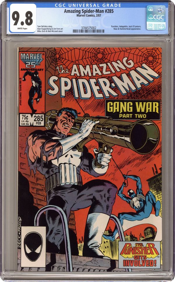 Direct Edition. Gang War: Part 2 of 5 -- "The Arranger Must Die!" Guest-starring the Punisher. Plot by Tom DeFalco. Script by Jim Owsley. Pencils by Alan Kupperberg. Inks by Jim Fern. Cover by Mike Zeck and Bob McLeod. The gang war takes a turn for the worse for the bad guys as the Punisher enters the fray! Frank Castle doesn't care where the Kingpin is or isn't. Or which crimes bosses have formed alliances with one another. He's planning to nail them all! When the Arranger calls a Midnight meeting of the crime lords, the Punisher adds himself to the guest list! But instead of a battle breaking out among the Hobgoblin, Jack O'Lantern, Rose, and Hammerhead; the furious fight erupts between Spider-Man and the Punisher! Is that any way to stop a gang war? Cameo appearances by Vanessa Fisk, Richard Fisk, Ned Leeds, Joe Robertson, and Ben Urich. (Notes: The initial subplot of the Spider-Man vs. Wolverine (1987) one-shot occurs in this story. This issue features a full-page ad for the Strikeforce Morituri (1986) series with art by Brent Anderson and Scott Williams.) 36 pages Cover price $0.75. Grade: CGC 9.8 explanation of grade Condition: Used (collectible)