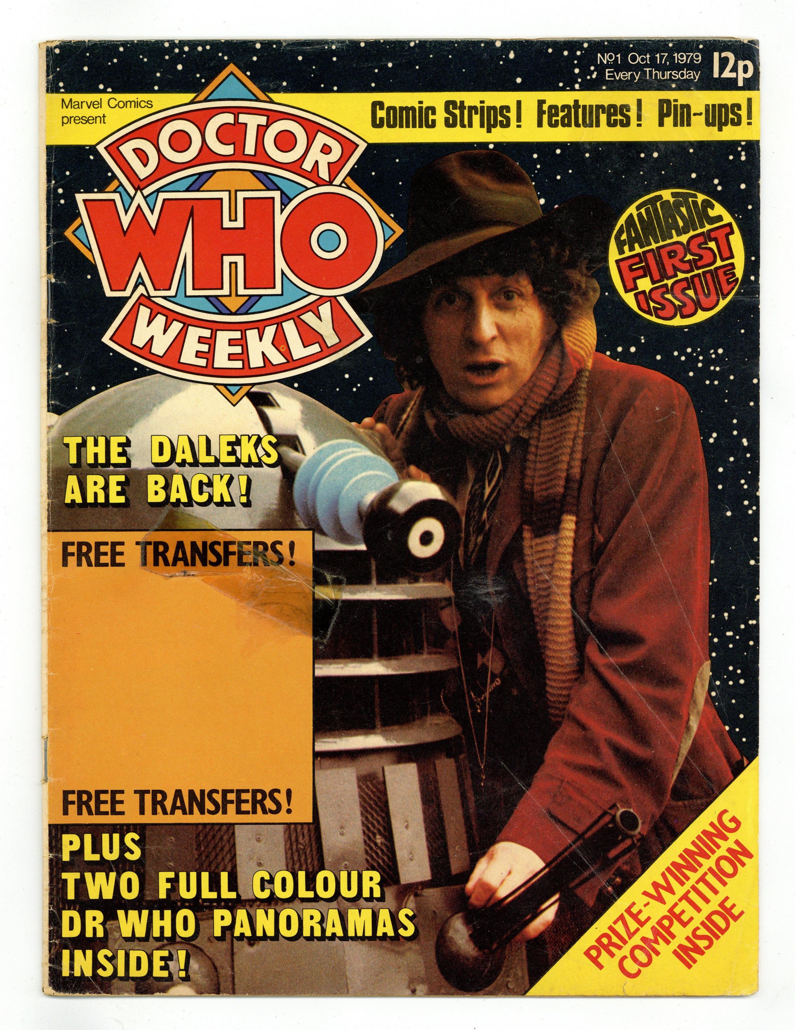 Includes: Vorgan Space Platform pinup; Doctor Who and the Iron Legion strip part one; an examination of the televised history of the Daleks; Tales From The TARDIS Featuring: War Of The Worlds strip part 1; The Story Of Doctor Who--A brief introduction to the series; Photo-File--William Hartnell; and Magnon 5 pinup. Oct 17, 1979. 28 pgs. Cover price: 12p. NOTE: May or may not include bonus transfers. Grade: VG- 3.5 explanation of grade Condition: Used (collectible)