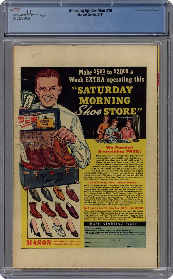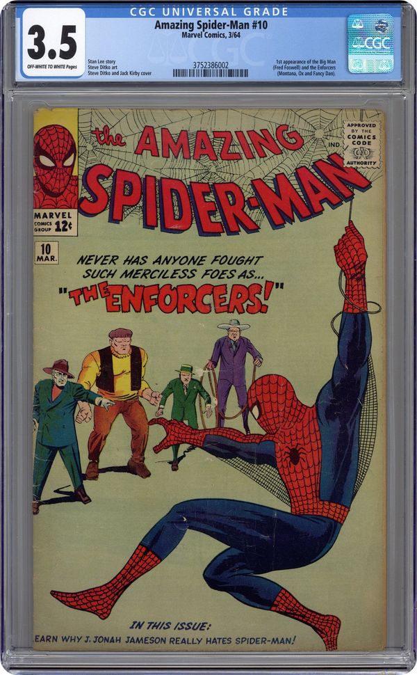 Cover pencils by Steve Ditko and Jack Kirby, inks by Steve Ditko and Dick Ayers. The Enforcers!, script by Stan Lee, art by Steve Ditko; The Enforcers try to shake down Betty Brant, which brings them to the attention of Spider-Man. House as for Fantastic Four #24, pencils by Jack Kirby, inks by George Roussos. Special Announcement Section wherein Stan plugs a few upcoming issues. X-Men #4, The Avengers #4 and Fantastic Four #25 are mentioned. 36 pgs. $0.12. Cover price $0.12. Grade: CGC 3.5 explanation of grade Condition: Used (collectible)