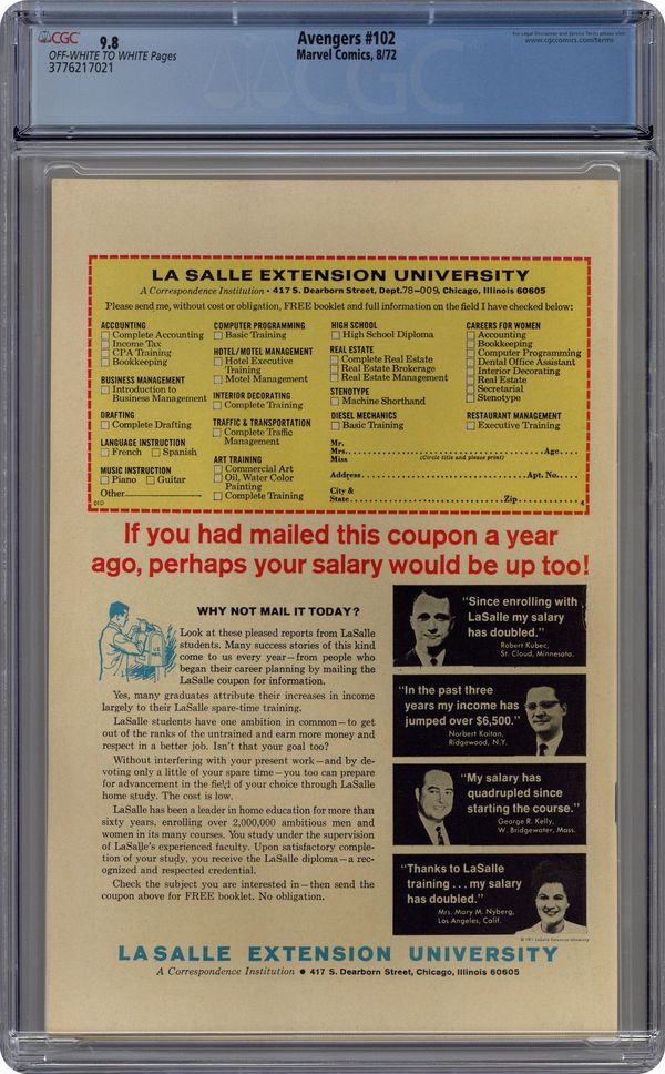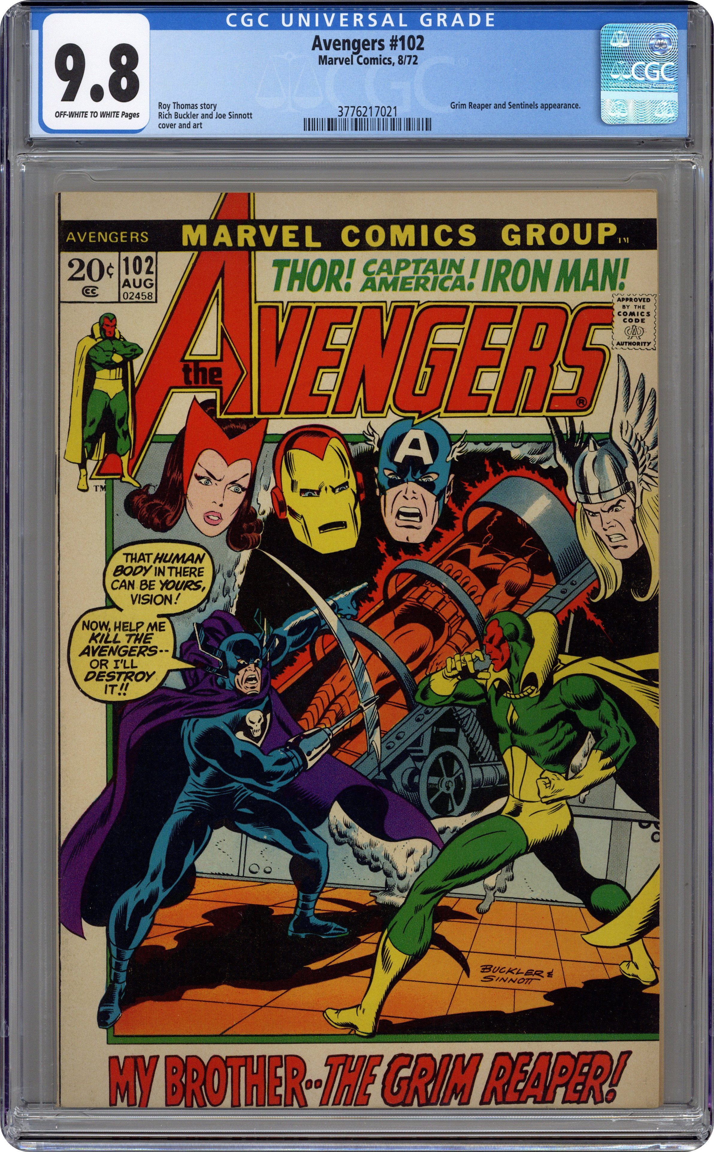 "What To Do Till The Sentinels Come!" Part 1 of 3. Plot suggestion by Chris Claremont. Script by Roy Thomas. Pencils by Rich Buckler. Inks by Joe Sinnott. Cover by Rich Buckler, Joe Sinnott, and John Romita (touch-ups). What would the Vision do if he had the opportunity to become human? The synthezoid avenger might just have that chance! But what if the man providing the means and the materials were none other than the Avengers' long-time foe, the Grim Reaper? During a clandestine meeting on the lower east side, the questions are asked. Now what will be the Vision's answers? Meanwhile, the Sentinels (last seen in Uncanny X-Men 59) have set their sights on a different team of super-heroes! Specifically Earth's Mightiest Heroes! And even more specifically the Scarlet Witch! When Wanda takes an evening walk through Central Park, the Sentinels strike! Quicksilver and the Vision rush to the Scarlet Witch's side for the showdown in Central Park! An excellent issue! Cameo appearance by General Thunderbolt Ross. Avengers Lineup: Captain America, Hawkeye, Iron Man, Quicksilver, Scarlet Witch, Thor, and the Vision. (Notes: The Grim Reaper previously appeared in Avengers 79. Wonder Man's comatose body appears for the first time since his apparent death in Avengers (1st series) 9.) 36 pages Cover price $0.20. Grade: CGC 9.8 explanation of grade Condition: Used (collectible)