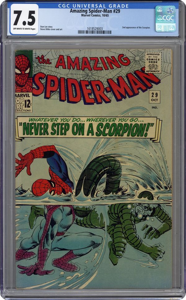 Cover by Steve Ditko. Never Step on a Scorpion!, script by Steve Ditko (plot) and Stan Lee (script), pencils by Steve Ditko, inks by Steve Ditko; Scorpion breaks free from jail and plans on killing both Spider-Man and J. Jonah Jameson. The Merry Marvel Bullpen Page; Ads for Spider-Man T-Shirt and MMMS fan club. Reprinted in Marvel Tales # 168. 36 pgs., full color. $0.12. Cover price $0.12. Grade: CGC 7.5 explanation of grade Condition: Used (collectible)