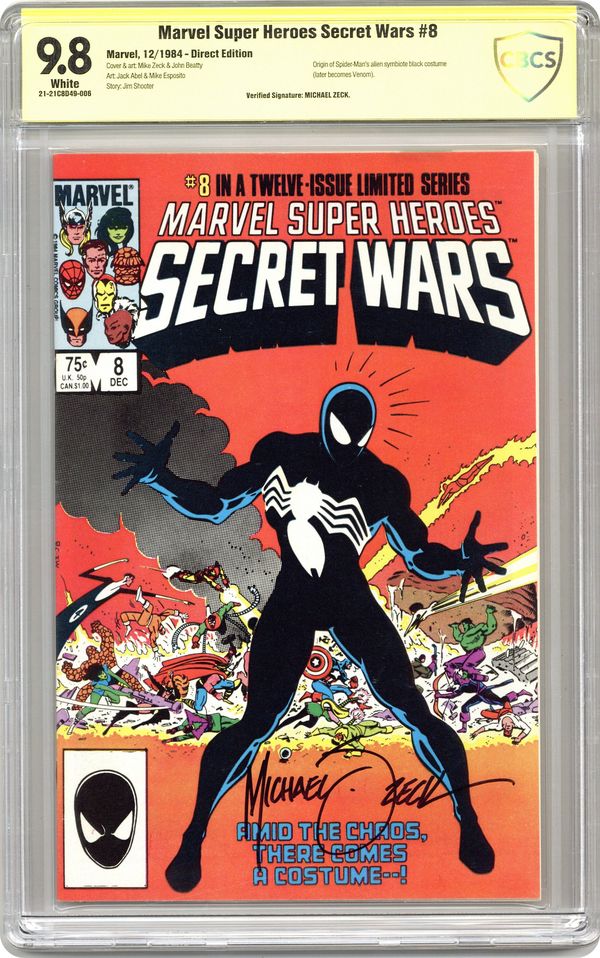 Direct Edition. "Invasion!" Part 8 of 12. Story by Jim Shooter. Art by Mike Zeck, John Beatty, Jack Abel, and Mike Esposito. Tired of being the villains' punching bags, the heroes take the fight to their deadly foes' own doorstep. What follows is one of the most titanic super hero/villain tussles of all time. Plus, Spidey gets a new costume. 1st in continuity appearance of Spider-Man's black costume. See Amazing Spider-Man (Vol. 1) #252, Marvel Team-Up #141, & Spectacular Spider-Man #90 for the first appearances from 7 months earlier. NOTE: This costume turns out to be an alien symbiote that will later bond with Eddie Brock and become the tenacious Spidey villain known as Venom. See Amazing Spider-Man #300. 36 pages, full color. Cover price $0.75. Grade: CBCS 9.8 explanation of grade Condition: Used (collectible)
