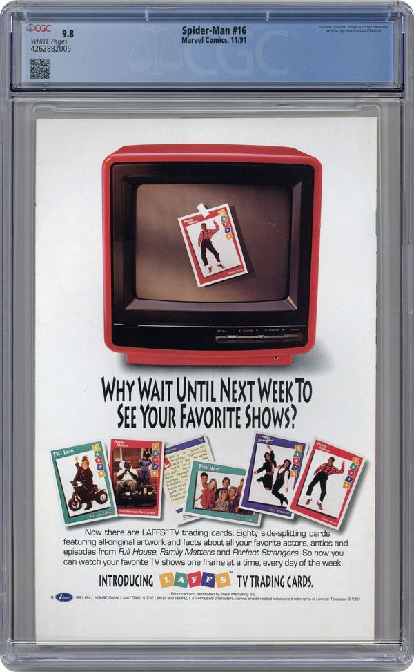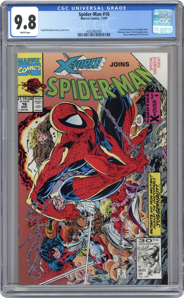 Direct Edition. X-Force crossover. "Sabotage" Part 1 of 2. Guest-starring X-Force. Script and art by Todd McFarlane. Plot assist by Rob Liefeld. Cover by Todd McFarlane. Plot continues from X-Force (1st series) #3. Superstar artist Todd McFarlane's spectacular run on the Spider-Man (1990) title comes to an end with a battle royal on the streets of lower Manhattan! The wall-crawler is web-swinging by the World Trade Center...when he stumbles across a major battle in progress between X-Force and the Juggernaut! Spider-Man knows Cain Marko is nigh unstoppable, but the youngsters of X-Force don't care! Can the web-slinger guide them to victory? Story concludes in X-Force #4. X-Force Lineup: Boom-Boom, Cable, Cannonball, Domino, Feral, Gideon, Shatterstar, Siryn, Sunspot, and Warpath. (Notes: This unique issue is drawn in widescreen/landscape format (horizontal) to maximize the action -- in the same manner as Fantastic Four 252. After this issue Todd McFarlane left Marvel and formed Image Comics with other superstar artists (Jim Lee, Marc Silvestri, and Erik Larsen to name a few). There he created Spawn -- one the most successful creator-owned characters in the history of the medium. Spawn has inspired spin-offs, cartoons, a movie, and one of the most successful toy lines of all time. - Odinson, Lone Star Archivist.) 32 pages. Cover price $1.75. Grade: CGC 9.8 explanation of grade Condition: Used (collectible)
