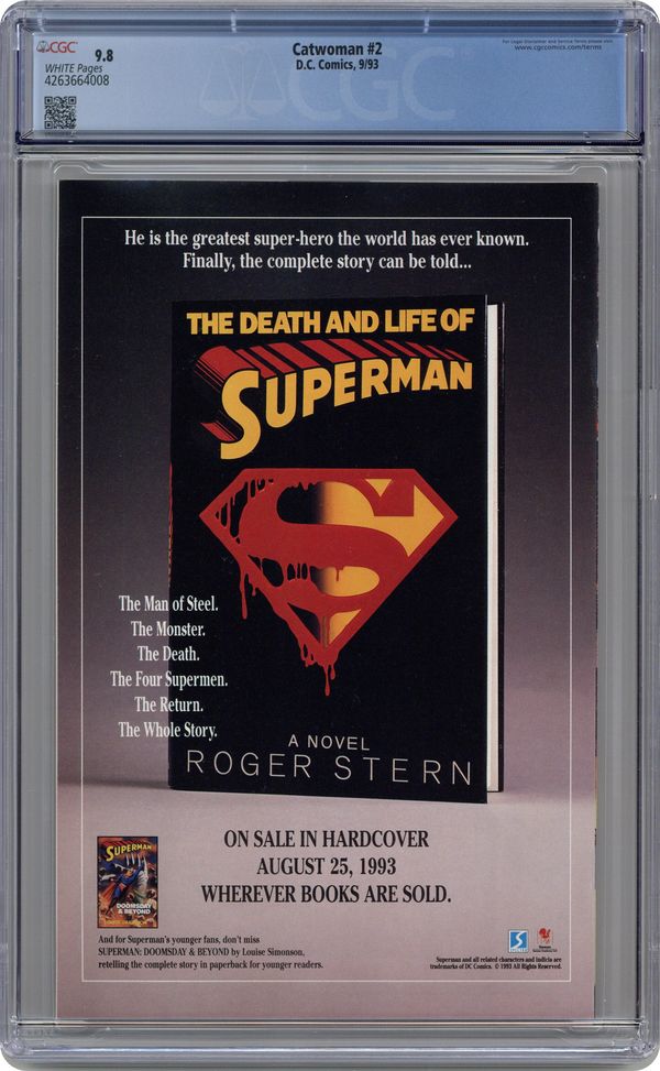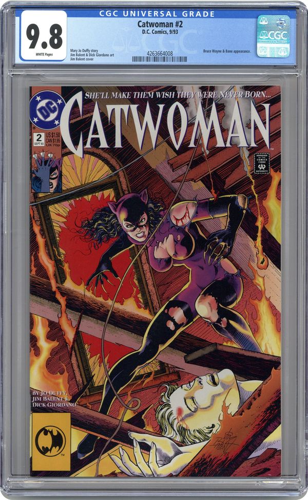Catwoman's on the trail of the assassin who fired a rocket into her apartment in "Life Lines Chapter 2: Blast from the Past!" Part 2 of 4, continued from the previous issue. Story continues next issue. Script by Jo Duffy, pencils by Jim Balent, inks by Dick Giordano. Cameos by Bane, Bruce Wayne, Alfred, Harvey Bullock. Balent cover. Cover price $1.50. Grade: CGC 9.8 explanation of grade Condition: Used (collectible)