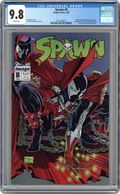 Direct Edition. "In Heaven!" Story by Alan Moore. Art by Todd McFarlane. Includes a B&W poster of Spawn by Frank Miller. Child murderer, Billy Kincaid, awakens in a strange dark place and he is not alone. One by one, the members of his group are taken, destroyed, or devoured by the macabre denizens of this foreboding place. One by one, until only Kincaid and small child remain. When this sick man cannot deny his base instincts, he soon learns that there are fates worse than death when one is sent to Hell! Cover price $1.95. Grade: CGC 9.8 explanation of grade Condition: Used (collectible)