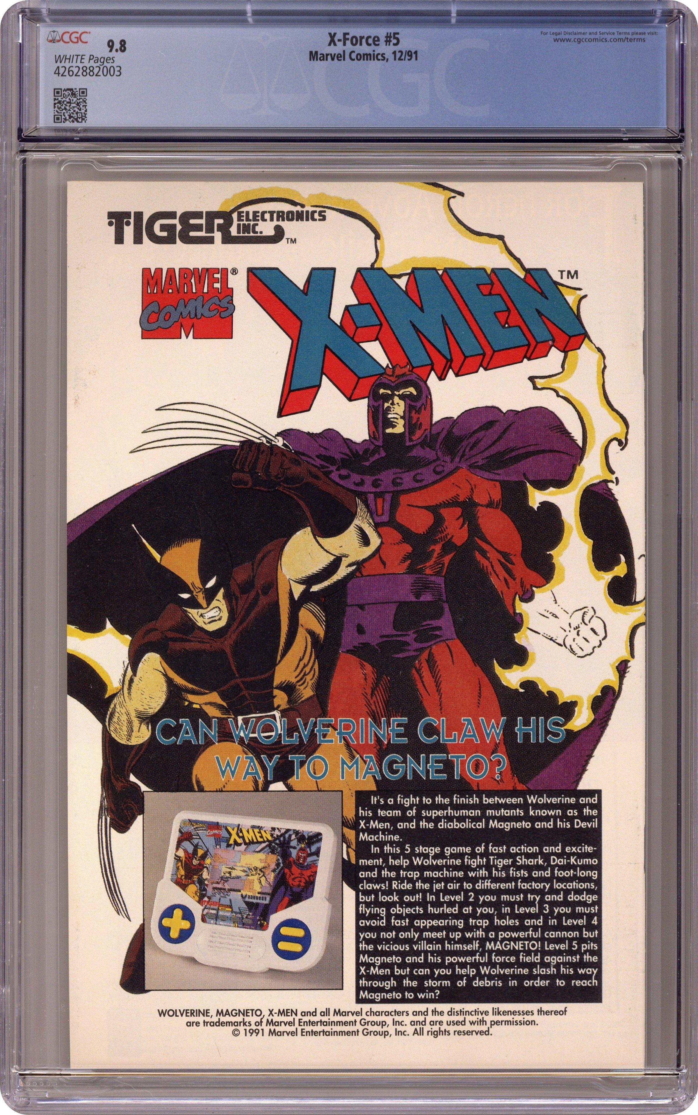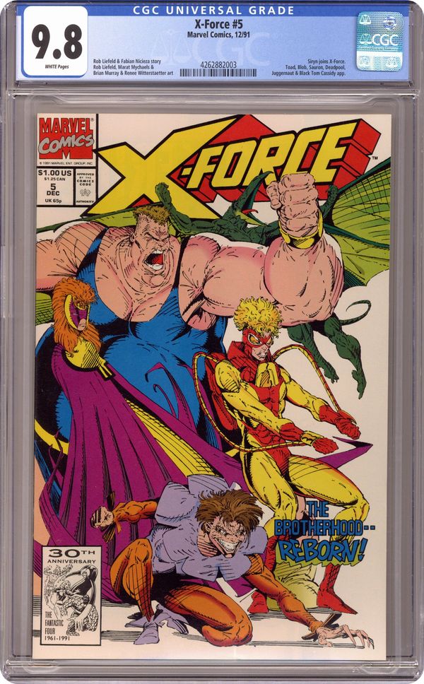 Ended Oct 19 2024 Winning Bid $26 Cover art by Rob Liefeld. Under the Magnifying Glass, script by Rob Liefeld (Plot) and Fabian Nicieza, pencils by Rob Liefeld (layouts), Marat Mychaels (pencils, first half of book), and Brian Murray (pencils, second half of book), inks by Rob Liefeld and Marat Mychaels; Toad captures Karl Lykos and forces him to steal life force from his girlfriend to transform into Sauron and join the new Brotherhood; Siryn joins X-Force. 36 pgs. $1.00. Cover price $1.00. Grade: CGC 9.8 explanation of grade Condition: Used (collectible)
