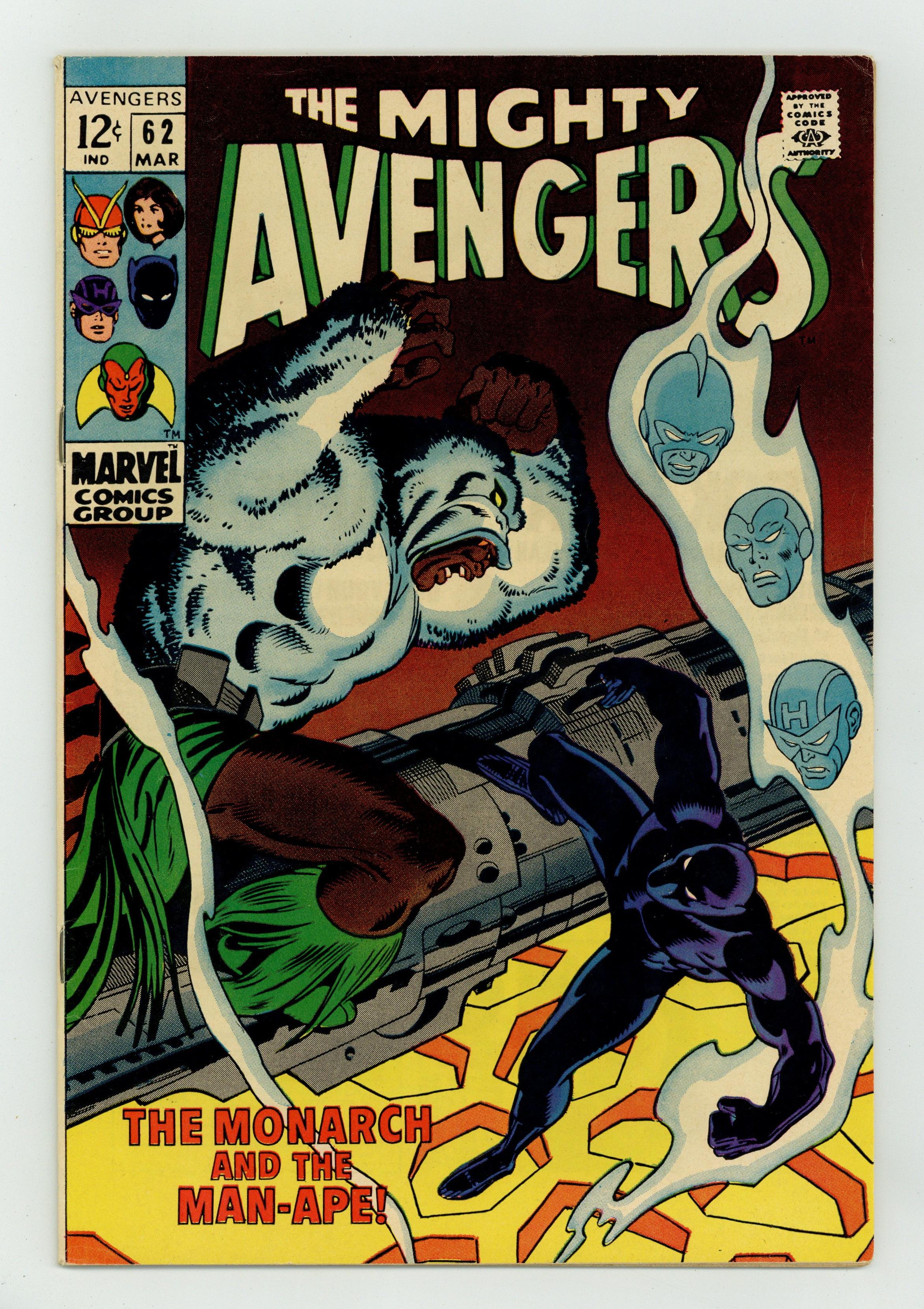 Ended Mar 5 2024 Winning Bid $55 "The Monarch and the Man-Ape" First appearance of the Man-Ape. Script by Roy Thomas. Pencils by John Buscema. Inks by George Klein. Cover by John Buscema and George Klein. After their encounter with Ymir and Surtur, the Avengers travel to the Black Panther's homeland to recuperate! But unfortunately there is something rotten in the state of Wakanda! M'Baku, one of T'Challa's mightiest warriors, has usurped the throne and secretly taken on the identity of the Man-Ape! However, the Avengers don't know that when they sit down for the evening feast! Once his teammates succumb to M'Baku's drugged wine, the Black Panther must face his royal challenger alone! In the heart of the jungle, T'Challa battles for his throne and his life vs. the ferocious Man-Ape! Appearance by the Black Knight. Avengers Lineup: Black Panther, Hawkeye, and the Vision. (Notes: The Man-Ape returns in Avengers 78. The cover logo changes to "The Mighty Avengers" thru issue 69. The letters page also contains a statement of ownership: average print run 428,600; average paid circulation 276,951. This story was reprinted in Jungle Action 5.) 36 pages. 12 cent cover price. Cover price $0.12. Grade: FN 6.0 explanation of grade Condition: Used (collectible)