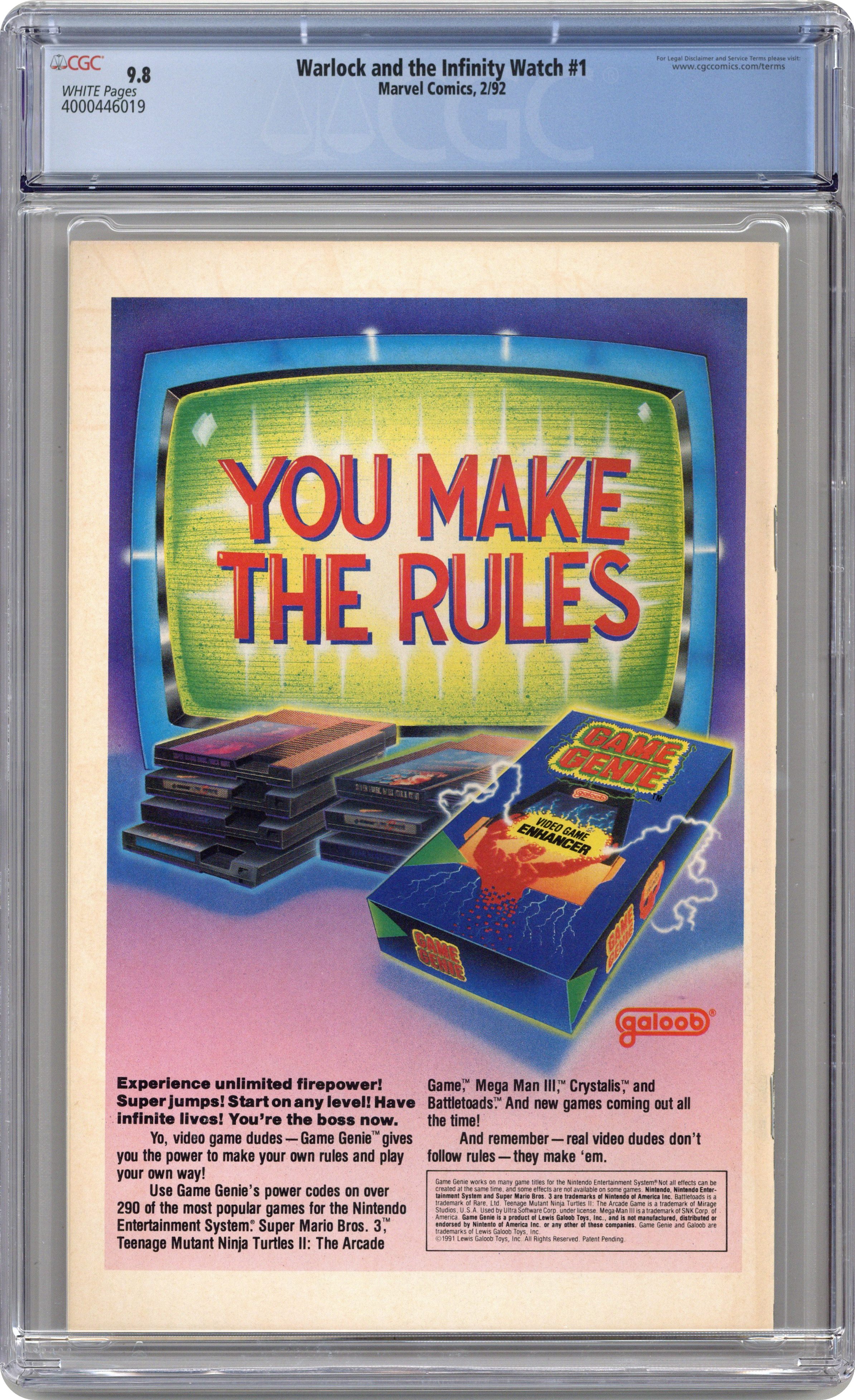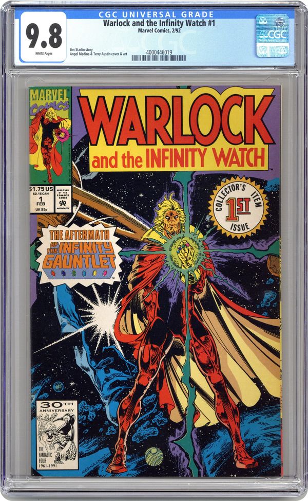 Direct Edition. Infinity Gauntlet Aftermath. Story continued from Infinity Gauntlet #6. "Judgment!" Story by Jim Starlin. Art by Angel Medina and Terry Austin. In the aftermath of the events in Infinity Gauntlet #6, Adam Warlock is in possession of the most powerful weapons in all the universe, the legendary Infinity Gems. Together they make him master of Space, Time, Power, Reality, the Mind, and the Soul. Now, Adam stands before the Living Tribunal and is accused by Eternity, a cosmic deity, of being unworthy to possess omnipotence. Baring witness to this trial are some of the most powerful beings in existence: Master Order and Lord Chaos, Mistress Love and Master Hate, the Stranger, the Celestials, Epoch, the enigmatic Watcher, and the Devourer of Worlds, Galactus. Will Adam Warlock surrender ultimate power, or will he engage in a battle that will surely destroy all creation? 32 pages. Cover price $1.75. Grade: CGC 9.8 explanation of grade Condition: Used (collectible)