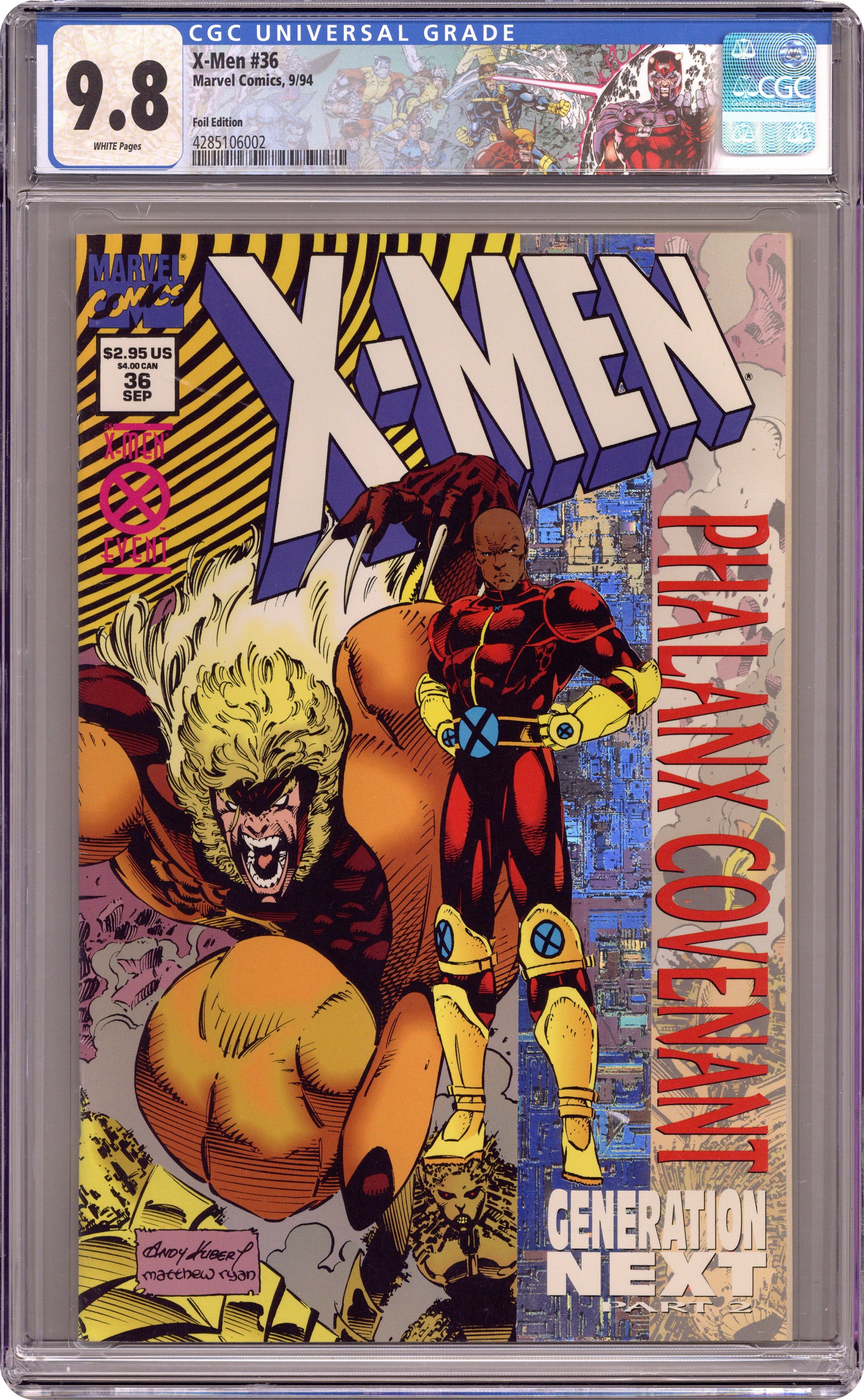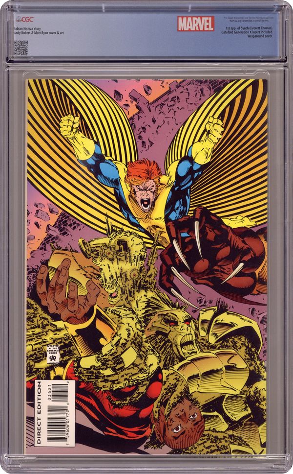 Ended Oct 13 2023 Winning Bid $34 Holographic edition. Direct Edition. Wraparound cardstock cover. Cover pencils by Andy Kubert, inks by Matt Ryan. The Phalanx Covenant Book One Generation Next Part 2: Drop the Leash, script by Fabian Nicieza, pencils by Andy Kubert, inks by Matt Ryan; The X-Men try to save the next generation of mutants from being assimilated by the Phalanx; Cont. from Uncanny X-Men #316; Cont. in Uncanny X-Men #317. 36 pgs. Cover price $2.95. Grade: CGC 9.8 explanation of grade Condition: Used (collectible)