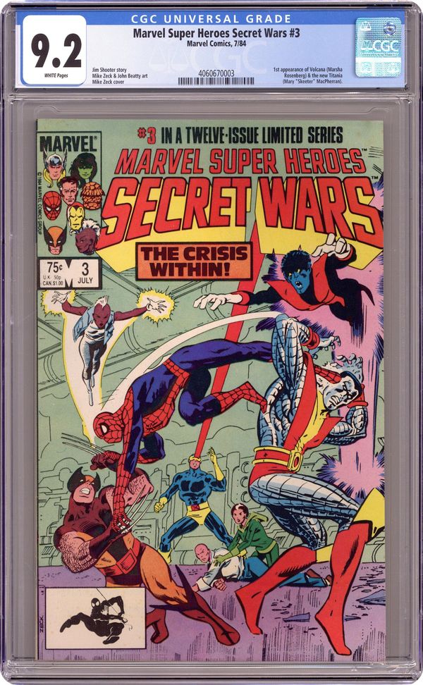 Direct Edition. "Tempest Without, Crisis Within!" Part 3 of 12. Story by Jim Shooter. Art by Mike Zeck and John Beatty. Can it be true? Do Marvel's Merry Mutants intend to betray the other heroes? Not if Spidey has anything to say about it. It's the Amazing Spider-Man vs. the Uncanny X-Men, and no matter who wins, the heroes lose. Meanwhile, Doctor Doom adds to his already formidable ranks. Enter: the super strong Titania and the fiery Volcana (1st appearance for both). 36 pages, full color. Cover price $0.75. Grade: CGC 9.2 explanation of grade Condition: Used (collectible)