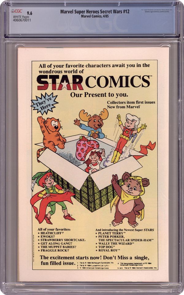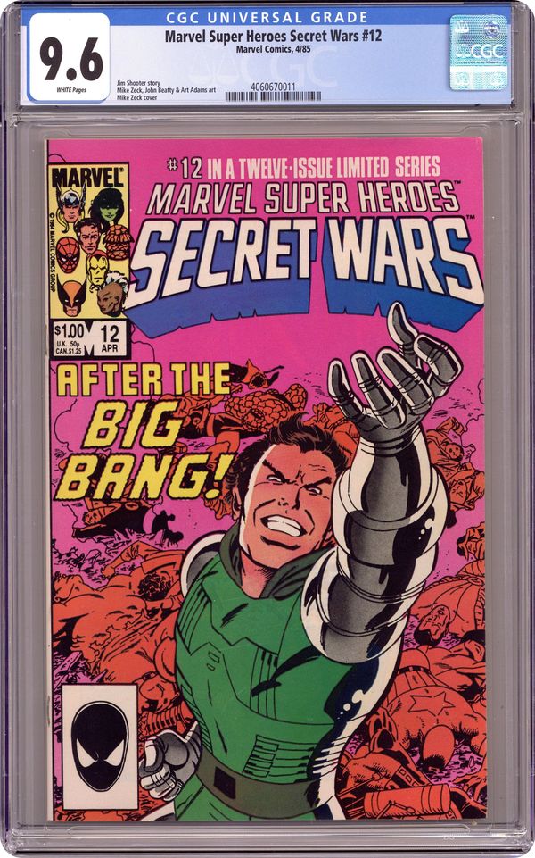 Direct Edition. "...Nothing to Fear...!" Part 12 of 12. Story by Jim Shooter. Art by Mike Zeck and John Beatty. Plus: Mike Mignola and Art Adams (some inks). This is it, the explosive conclusion to the most epic adventure of all. The Marvel heroes rally behind Captain America and confront a cosmically empowered Doctor Doom in a final showdown that will change everything. The end of this epic story has great ramifications throughout the Marvel Universe. Plot threads from this issue continue in Thing #11, Fantastic Four #265, Amazing Spider-Man #252, Avengers #243, and Secret Wars II #1. 36 pages, full color. Cover price $1.00. Grade: CGC 9.6 explanation of grade Condition: Used (collectible)