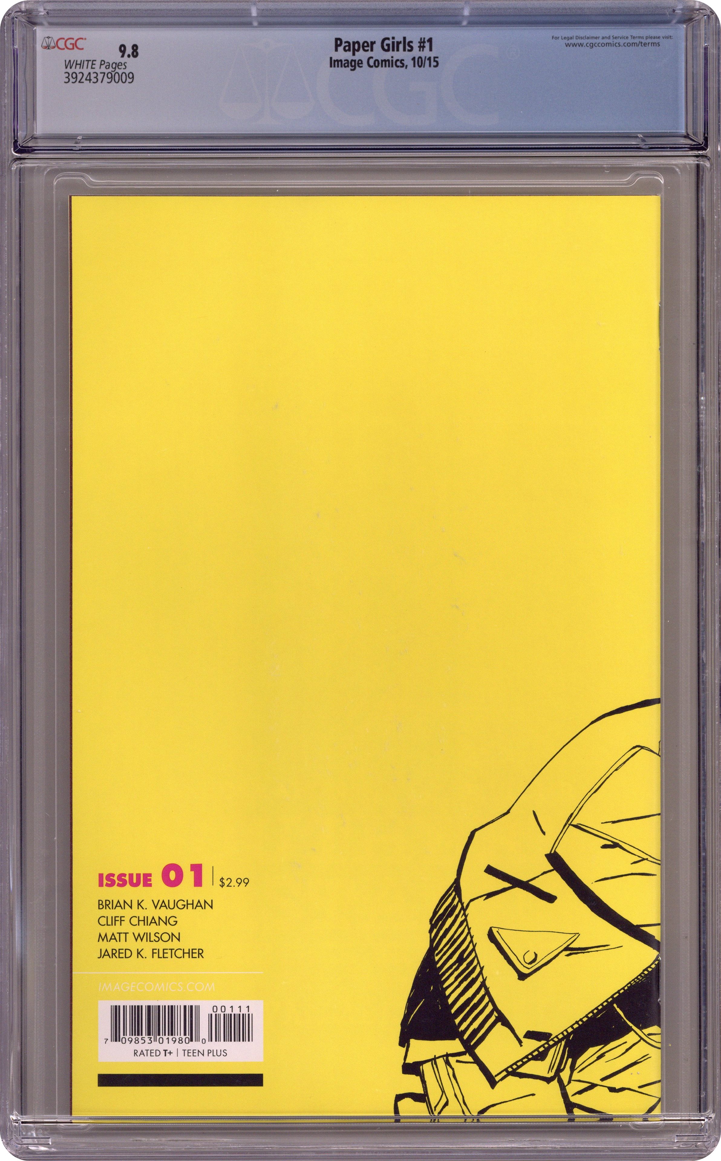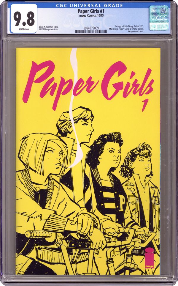 Written by Brian K. Vaughan. Art and Cover by Cliff Chang. In the early hours after Halloween of 1988, four 12-year-old newspaper delivery girls uncover the most important story of all time. Stand By Me meets War of the Worlds in this mysterious young adult adventure! 48 pages, full color. Rated T+ Cover price $2.99. Grade: CGC 9.8 explanation of grade Condition: Used (collectible)