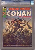 Painted cover art by Boris Vallejo. Conan and Red Sonja star in "Curse of the Undead-Man," script by Roy Thomas, pencils by John Buscema, inks by Pablo Marcos; Conan and Red Sonja put an end to the undead sorcerer Costranno; Adapted from the story "Mistress of Death" by Robert E. Howard and Gerald Page; continued in part from Conan the Barbarian 42. "Red Sonja" (3rd appearance), script by Thomas, art by Esteban Maroto, Neal Adams, and Ernie Chan (as Ernie Chua); When Red Sonja returns with a tiara she was sent for by King Ghannif she learns her "reward" is to be made a part of his harem. "Blackmark," script and art by Gil Kane (reprinting chapter 1 from the Bantam Books paperback); a Conan reprint from Savage Tales 1 (plus the additional splash page from Conan the Barbarian 16). "The Frost Giant's Daughter," script by Thomas, art by Barry Windsor-Smith (adapted from the Howard story); Conan chases Atali across the snow, slays her two frost giant brothers, and catches her; Her father, Ymir then takes her from Conan. "Conan's Women Warriors," an article by Fred Blosser illustrated by Esteban Maroto, Steve Gan, Hugh Rankin (original Weird Tales art), and Roy Krenkel; and "An Atlantean in Aquilonia," a Kull article by Glenn Lord illustrated by John Severin and Ross Andru. Alfredo Alcala pin-up. Maroto frontispiece. 84 pgs., B&W. Cover price $1.00. Grade: CGC 9.6 explanation of grade Condition: Used (collectible)