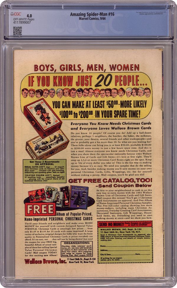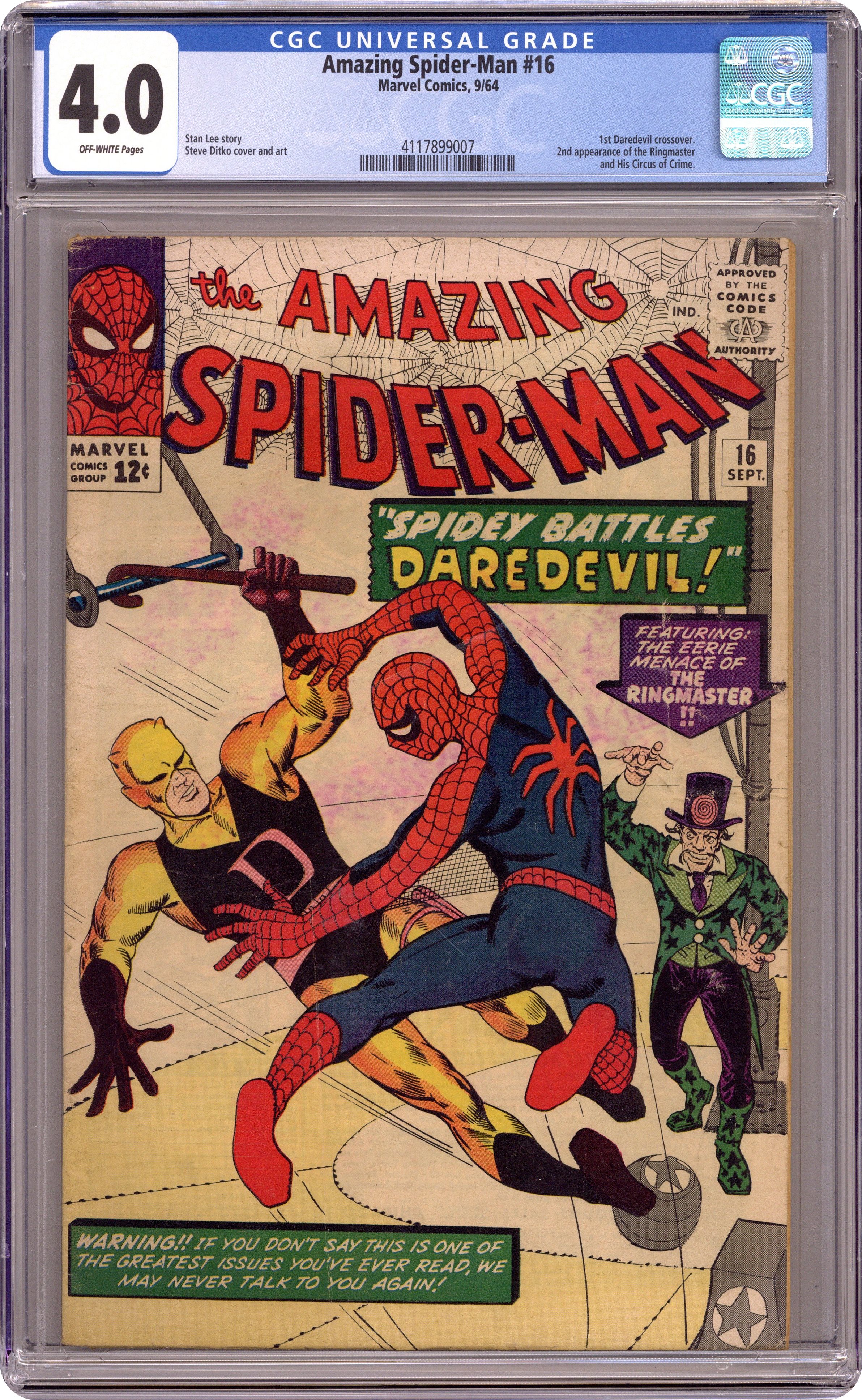 Cover art by Steve Ditko. Duel with Daredevil, script by Stan Lee, art by Steve Ditko; When the Circus of Crime comes to town, they advertise that Spider-Man will be appearing in an attempt to fill the big top before they rob it; Spider-Man sees the advertisements and decides he will show up; He is hypnotized along with the rest of the audience, but unfortunately for the Circus of Crime, the Daredevil is in attendance and immune to the Ringmaster's hat. Reprinted in Marvel Tales # 11 and 154. 36 pgs. $0.12. Cover price $0.12. Grade: CGC 4.0 explanation of grade Condition: Used (collectible)