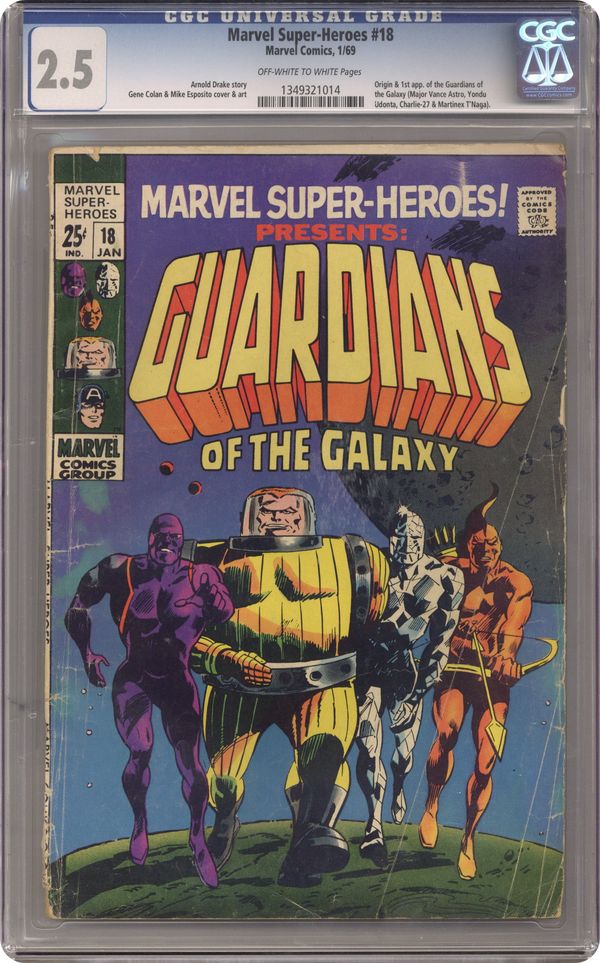 Ended Oct 2 2023 Winning Bid $125 Giant-size issue. Origin and 1st appearance of the Guardians of the Galaxy. Script by Arnold Drake, pencils by Gene Colan, inks by Mike Esposito (as Mickey Demeo). The remainder of the issue contains Golden Age reprints: the Sub-Mariner ("Courage"); and the All Winners Squad featuring Miss America, the Human Torch, and Captain America (from All Winners 21). Letter to the editor from comics writer Steven Grant. Colan cover pencils. Cover price $0.25. Grade: CGC 2.5 explanation of grade Condition: Used (collectible)