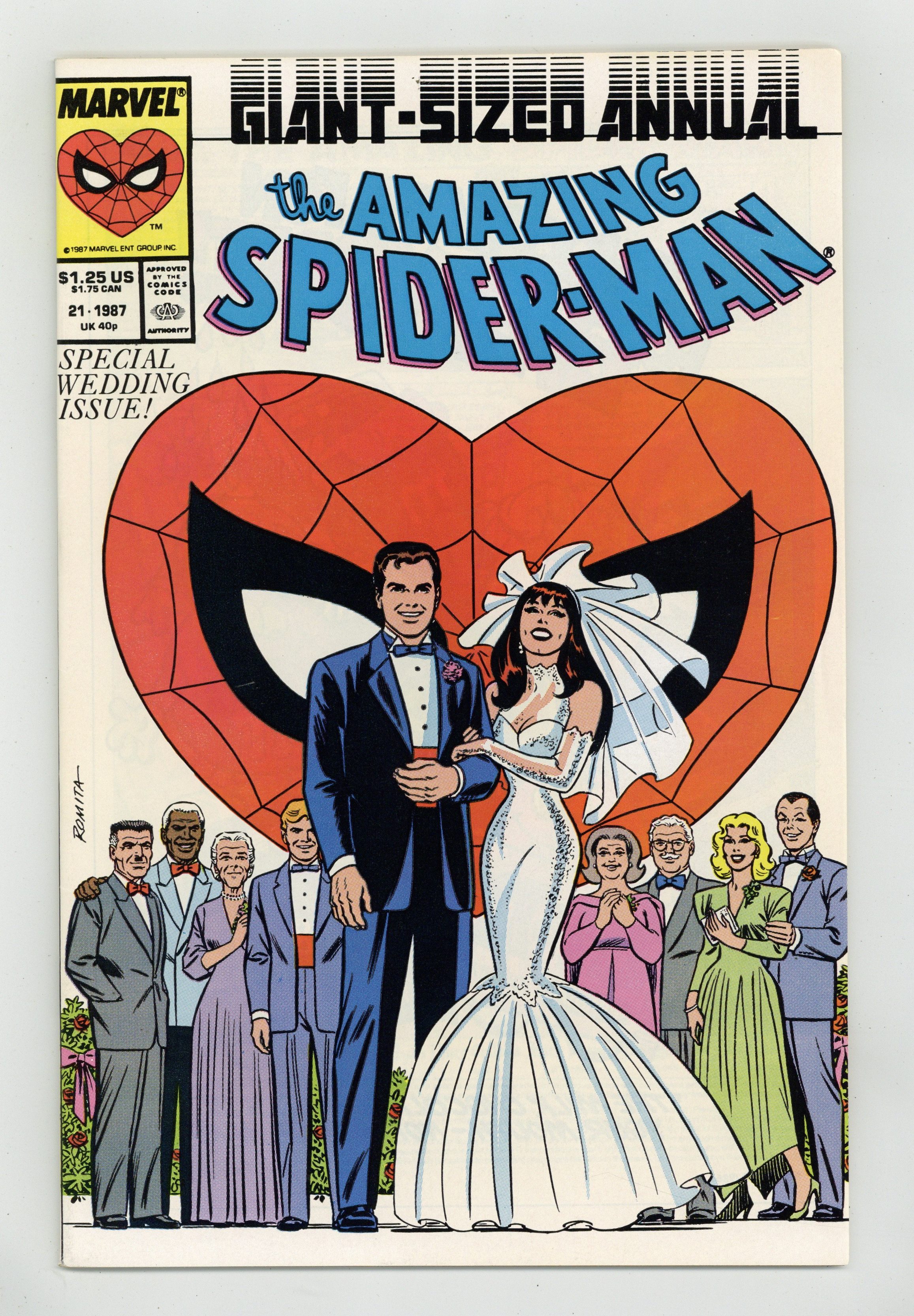 Ended Dec 12 2023 Winning Bid $34 Direct Edition. The marriage of Peter Parker and Mary Jane Watson in "The Wedding." Plot by Jim Shooter. Script by David Michelinie. Pencils by Paul Ryan. Inks by Vince Colletta. Cover by John Romita Sr. Direct Edition. At long last wedding bells ring for Peter Parker and Mary Jane Watson! What an exciting day! The blushing bride will need something old, something new, something borrowed, and something blue! While the Amazing Spider-Man will need to take care of two things before the big day! First, the easy task...short circuit Electro's latest scheme! And second, the tough one...put the memory and heartache of Gwen Stacy in the past forever. Will another trip to the Brooklyn Bridge bring peace to the wondrous wall-crawler? Or will the ghosts of days gone by derail a bright future with Mary Jane? Carpe diem, web-slinger! Appearances by Flash Thompson, Harry Osborn, Liz Osborn, Betty Leeds, Aunt May, Anna Watson, Joe Robertson, J. Jonah Jameson, and Willi Smith. Flashback cameos by the Green Goblin, Gwen Stacy, and Uncle Ben. (Notes: Peter and Mary Jane go on their honeymoon in Spectacular Spider-Man Annual 7. The Direct Edition cover features Peter Parker's friends and family. The Newsstand Edition depicts Spider-Man's friends and foes. Amazing Spider-Man Annual 21 was one of the first issues Marvel published with two different covers. This story was reprinted in the 1991 trade paperback: the Amazing Spider-Man - The Wedding.) 52 pages. Cover price $1.25. Grade: VF+ 8.5 explanation of grade Condition: Used (collectible)
