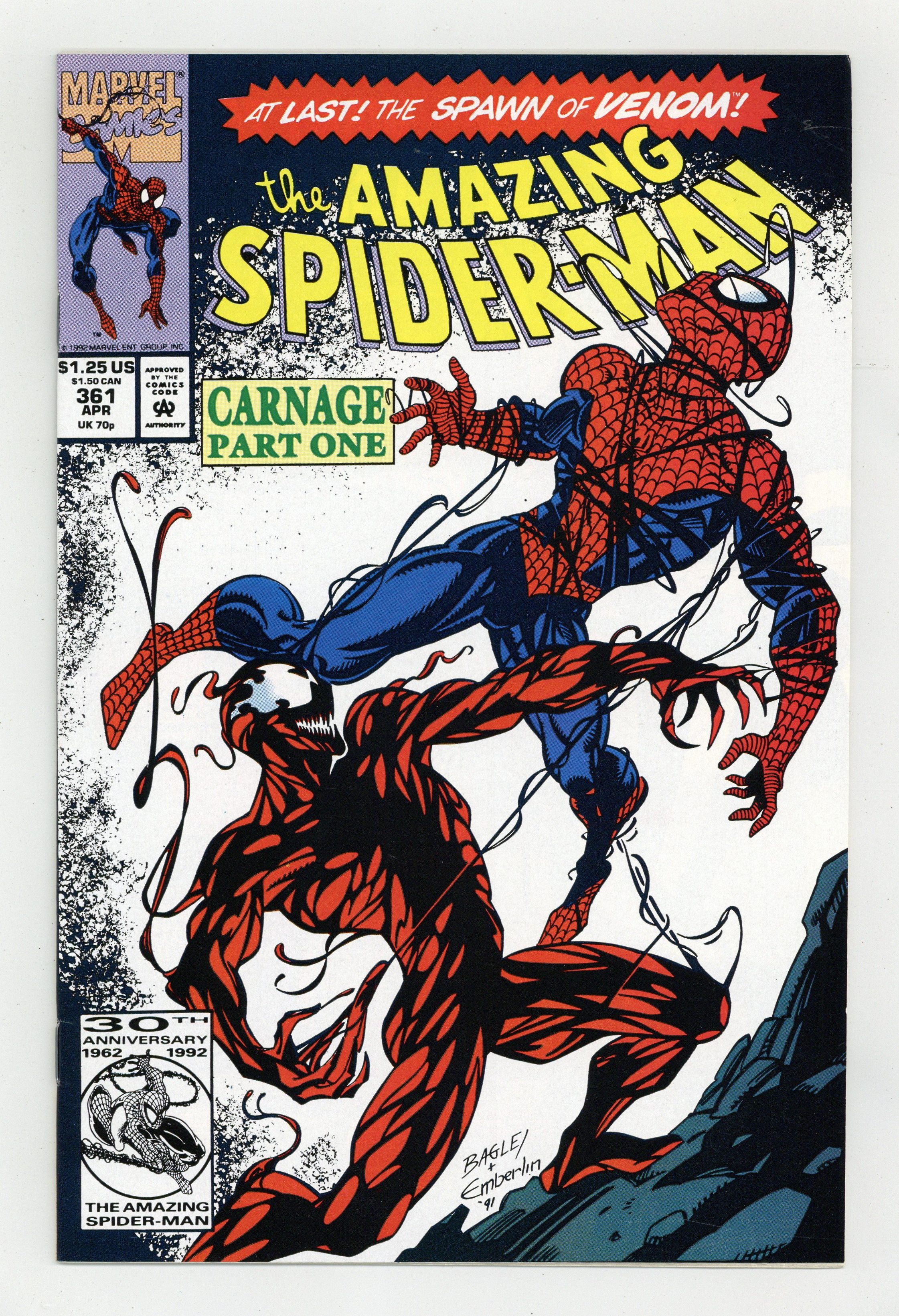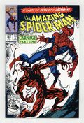 First Printing. Direct Edition. First (full) appearance of Carnage in "Savage Genesis!" Part 1 of 3. Script by David Michelinie. Pencils by Mark Bagley. Inks by Randy Emberlin. Cover by Mark Bagley and Randy Emberlin. Blood runs in the streets as a serial killer roams New York City! And as the web-slinger investigates the murders, he notices a very disturbing similarity to another killer's modus operandi! In a burned-out building in Brooklyn, the spectacular one comes face-to-face with his new homicidal foe...Carnage! Can the wall-crawler end Cletus Kasady's rampage in their very first encounter? Cameo appearances by Aunt May and Mary Jane Watson. Flashback cameo by Venom. (Note: This three-part story was reprinted in 2011 in the trade paperback: Spider-Man -- The Vengeance of Venom.) 36 pages, full color. $1.25 cover price. NOTE: Most of these were distributed with slight printer tears in the bottom edge of the cover. Cover price $1.25. Grade: VF+ 8.5 explanation of grade Condition: Used (collectible)