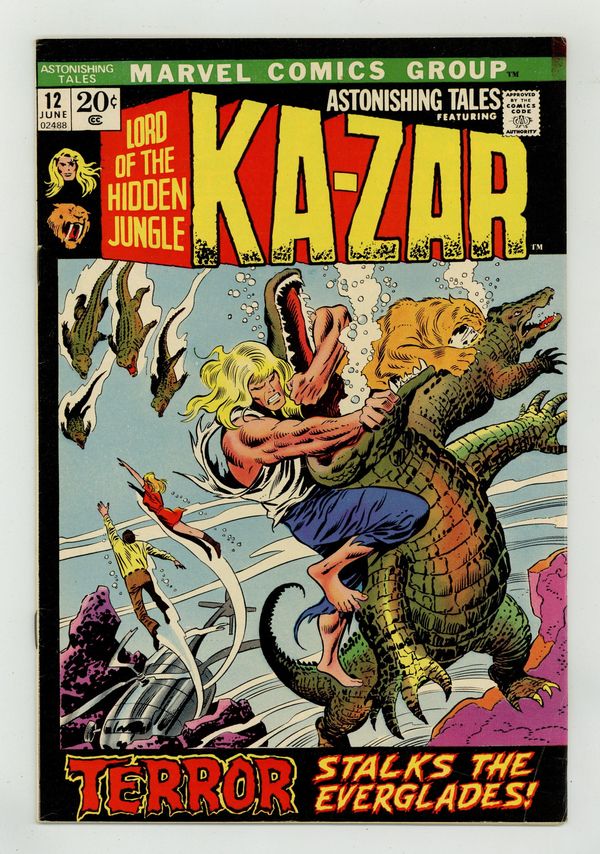 Cover pencils by John Buscema, inks by Joe Sinnott. Terror Stalks the Everglades!, script by Roy Thomas (pages 1-9, 17-21) and Len Wein (pages 10-16), pencils by John Buscema (pages 1-9, 17-21), Neal Adams (pages 10-16), and John Romita (touchups) (pages 10-16), inks by Dan Adkins (pages 1-9, 17-21), none (pages 10-16); Ka-Zar and Zabu fly to the Everglades to help Barbara Morris and Paul Allen search for Ted Sallis; Once there they encounter the Man-Thing and AIM agents; Also, the back story of how Dr Calvin was shot after the origin tale of Man-Thing in Savage Tales #1 is told. Cover price $0.20. Grade: FN- 5.5 explanation of grade Condition: Used (collectible)