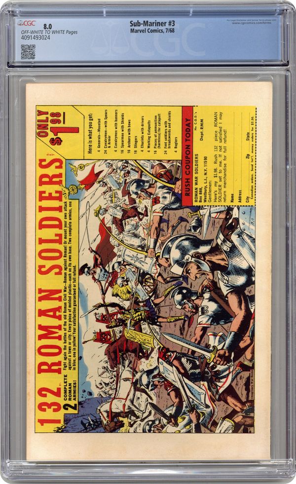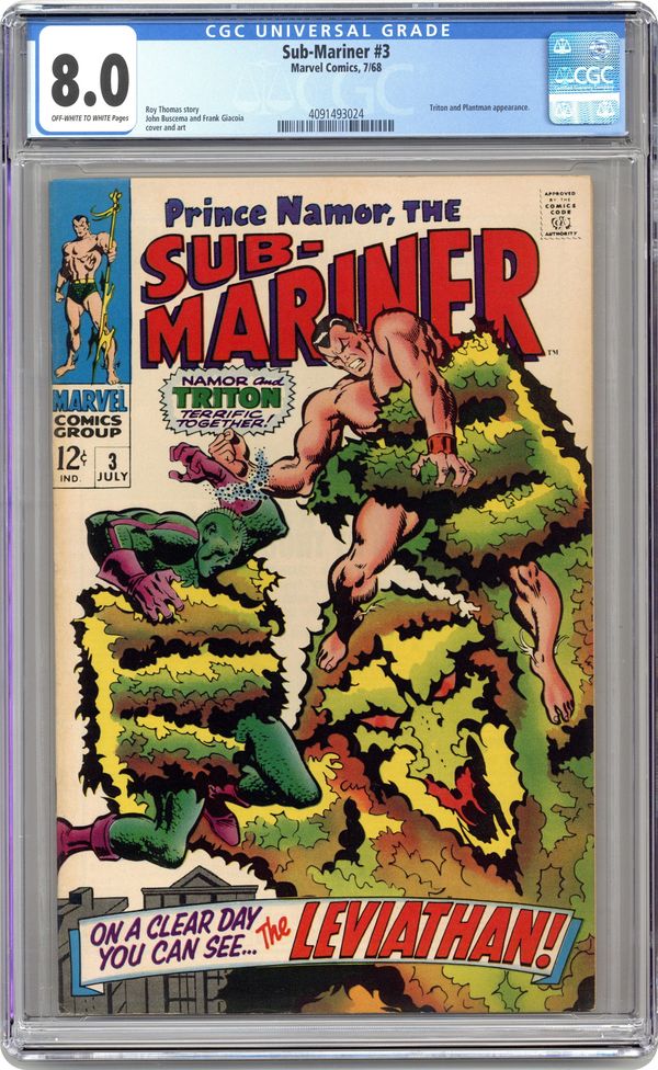 "On a Clear Day You Can See the Leviathan!" Guest-starring Triton. Written by Roy Thomas. Art by John Buscema and Frank Giacoia. can even the Savage Sub-Mariner and the uncanny Inhuman Triton stop the mad scheme of the diabolical Plant Man? 32 pages, FC. Cover price $0.12. Grade: CGC 8.0 explanation of grade Condition: Used (collectible)