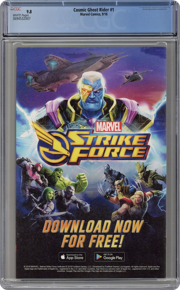 Ended Aug 27 2024 Winning Bid $28 Written by Donny Cates. Art by Dylan Burnett. Cover by Geoff Shaw. EXPLODING FROM THE PAGES OF THANOS! Frank Castle was the Punisher. A deal with the devil made him Ghost Rider. A deal with Galactus made him cosmic. A deal with Thanos made him…DEAD?!? Not to worry, he's coming back, and he's got a plan to make the universe a better place that's going to lead him into an even CRAZIER adventure than he's ever been in! Join hot new comic (and cosmic?) writer Donny Cates (THANOS, DOCTOR STRANGE) as he pushes his wildest creation past the breaking point! 36 pages, full color. Rated T+ Cover price $3.99. Grade: CGC 9.8 explanation of grade Condition: Used (collectible)