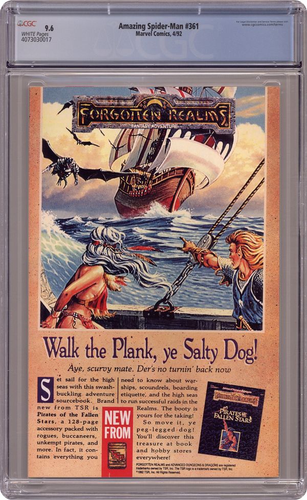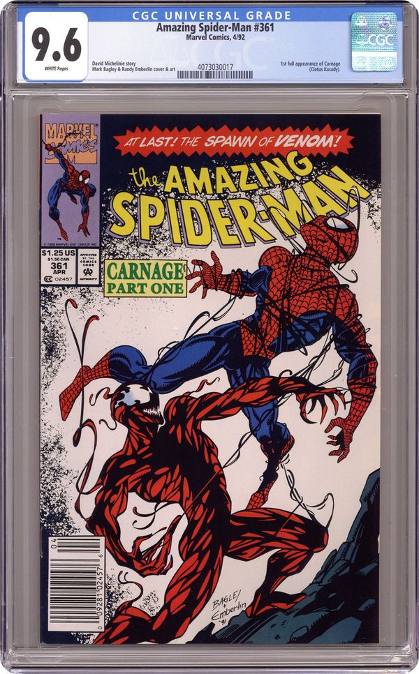 First Printing. Newsstand Edition. First (full) appearance of Carnage in "Savage Genesis!" Part 1 of 3. Script by David Michelinie. Pencils by Mark Bagley. Inks by Randy Emberlin. Cover by Mark Bagley and Randy Emberlin. Blood runs in the streets as a serial killer roams New York City! And as the web-slinger investigates the murders, he notices a very disturbing similarity to another killer's modus operandi! In a burned-out building in Brooklyn, the spectacular one comes face-to-face with his new homicidal foe...Carnage! Can the wall-crawler end Cletus Kasady's rampage in their very first encounter? Cameo appearances by Aunt May and Mary Jane Watson. Flashback cameo by Venom. (Note: This three-part story was reprinted in 2011 in the trade paperback: Spider-Man -- The Vengeance of Venom.) 36 pages, full color. $1.25 cover price. NOTE: Most of these were distributed with slight printer tears in the bottom edge of the cover. Cover price $1.25. Grade: CGC 9.6 explanation of grade Condition: Used (collectible)