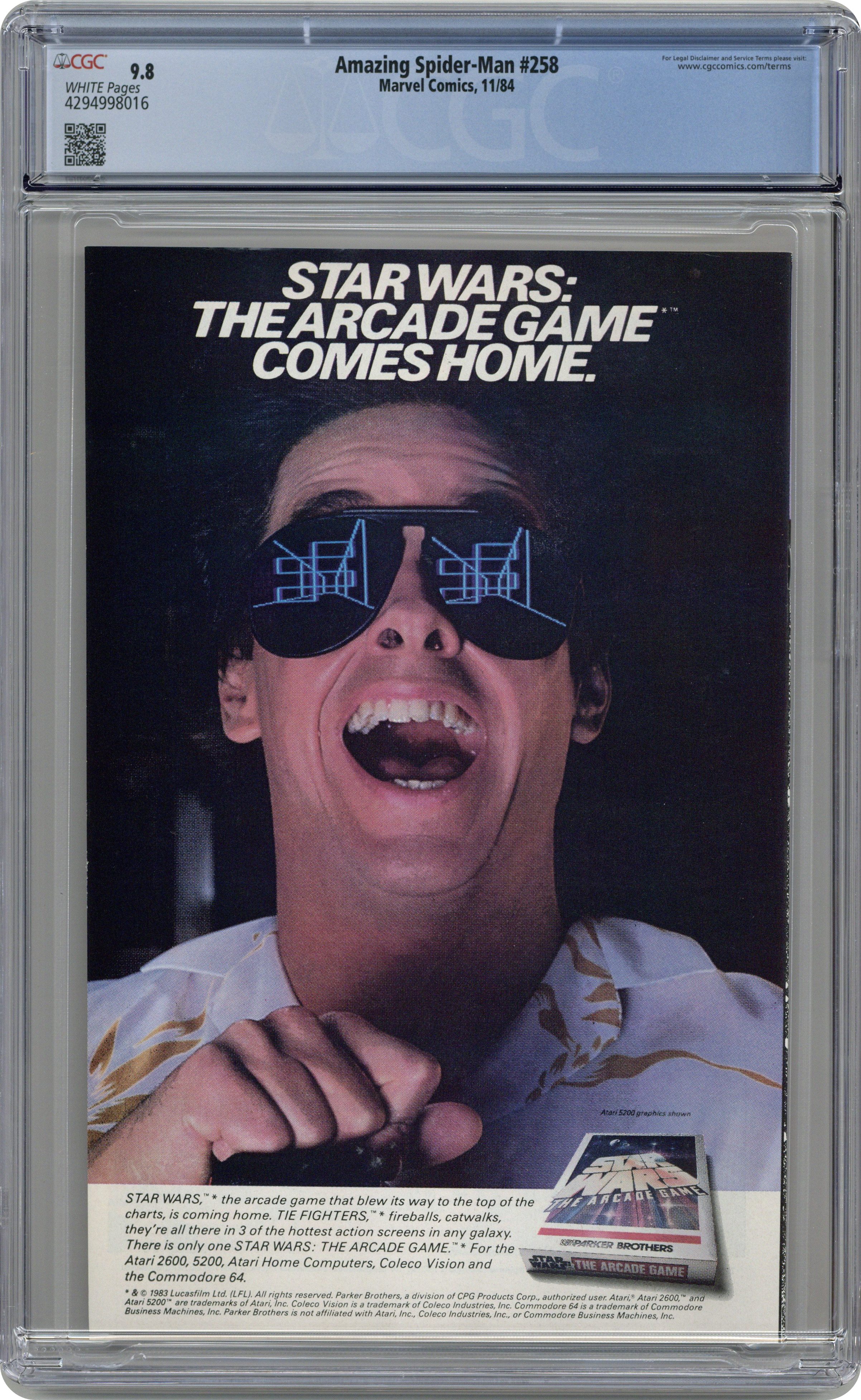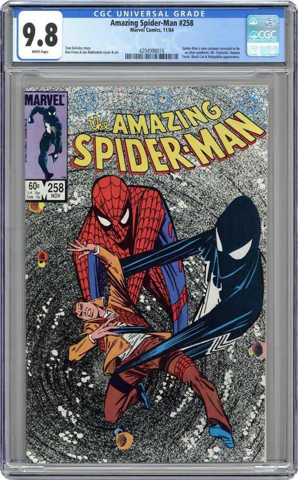 Direct Edition. "The Sinister Secret of Spider-Man's New Costume!" Guest-starring Mr. Fantastic and the Human Torch. Script by Tom DeFalco. Pencils by Ron Frenz. Inks by Joe Rubinstein. Cover by Ron Frenz and Joe Rubinstein. Chaos erupts at 410 Chelsea when Mary Jane Watson and the Black Cat meet inside Peter Parker's apartment! Wow, what a shocking development! To say that the web-slinger has some explaining to do...would be the understatement of the year! After the dust settles, the wall-crawler swings over to the Baxter Building to let Reed Richards analyze his new black costume. When Spider-Man learns his costume is "alive," he tries to pull it off; but the alien symbiote has other ideas! Can the Fantastic Four help Spidey with his major wardrobe malfunction? Cameo appearances by the Rose, Hobgoblin, and Puma. (Notes: The Black Cat and Mary Jane Watson are formally introduced to one another in Spectacular Spider-Man 123. The cover does not display the typical UPC box in the lower left-hand corner. This issue was reprinted in Marvel Tales 272.) 36 pages. Cover price $0.60. Grade: CGC 9.8 explanation of grade Condition: Used (collectible)