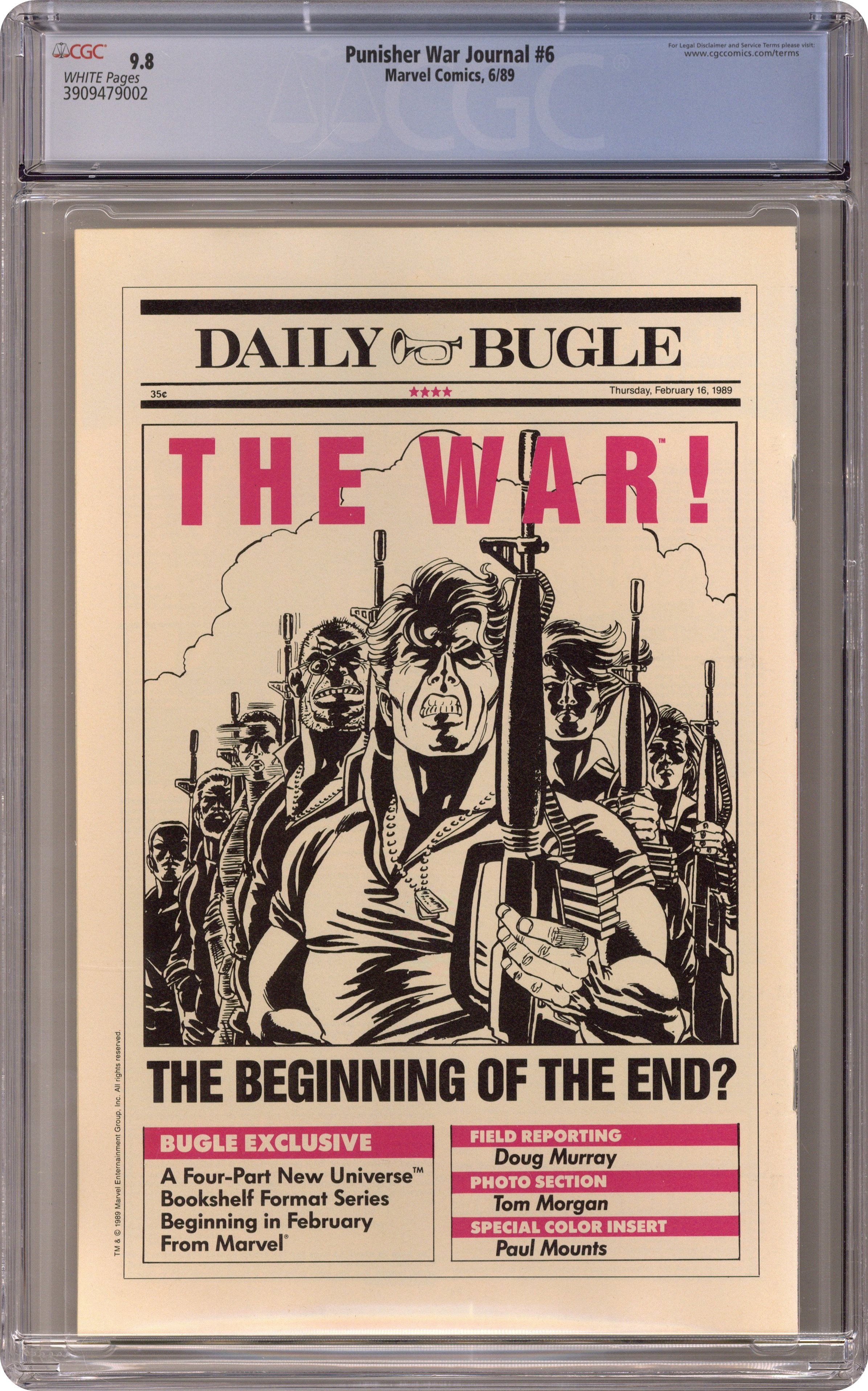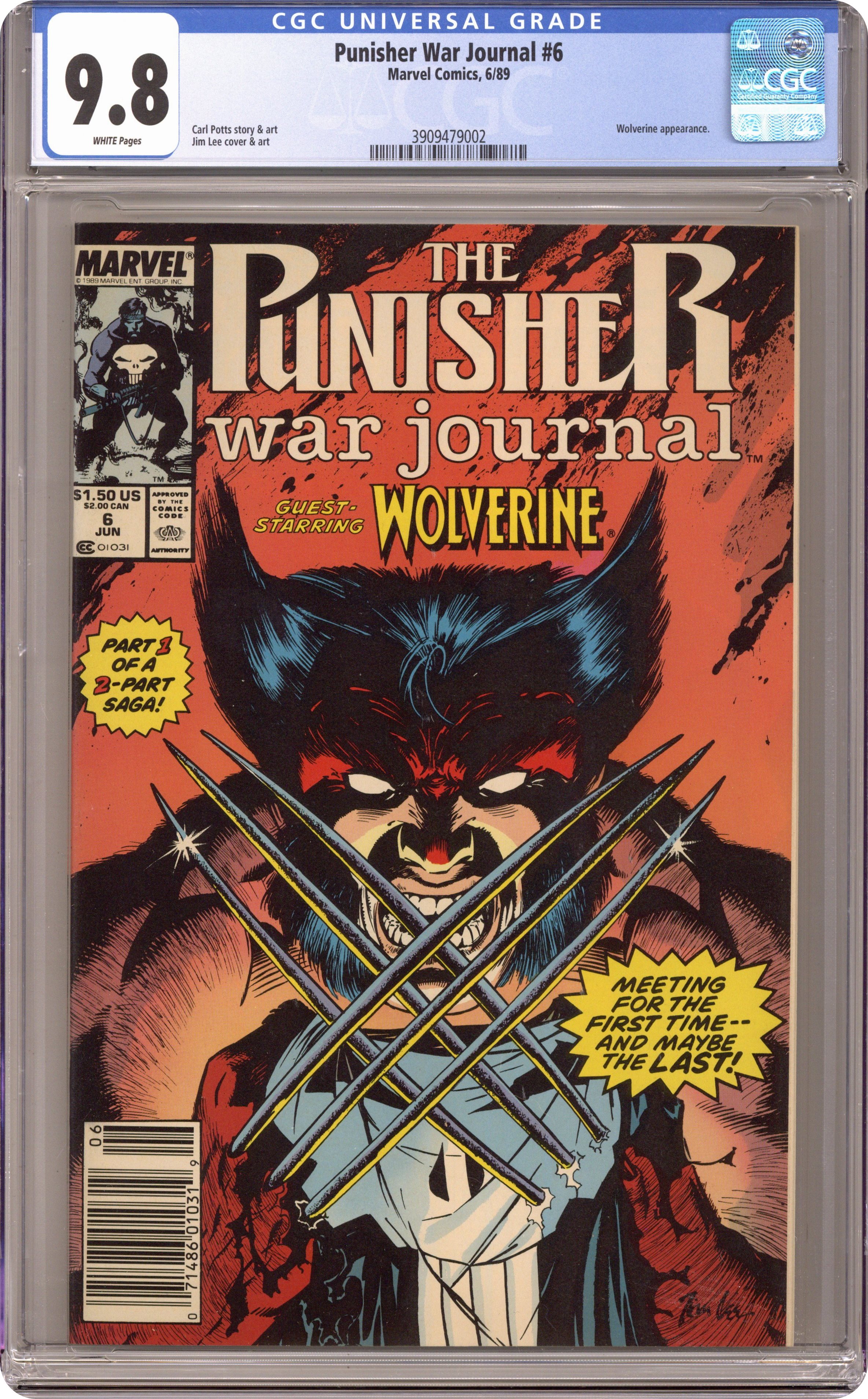 Direct Edition. Cover art by Jim Lee. On the Track of Unknown Animals, script by Carl Potts, pencils by Carl Potts and Jim Lee, inks by Jim Lee; at Microchip's behest, Punisher goes to Africa as part of a dinosaur hunting expedition; Punisher battles Wolverine in the African jungle. 36 pgs. $1.50. Cover price $1.50. Grade: CGC 9.8 explanation of grade Condition: Used (collectible)